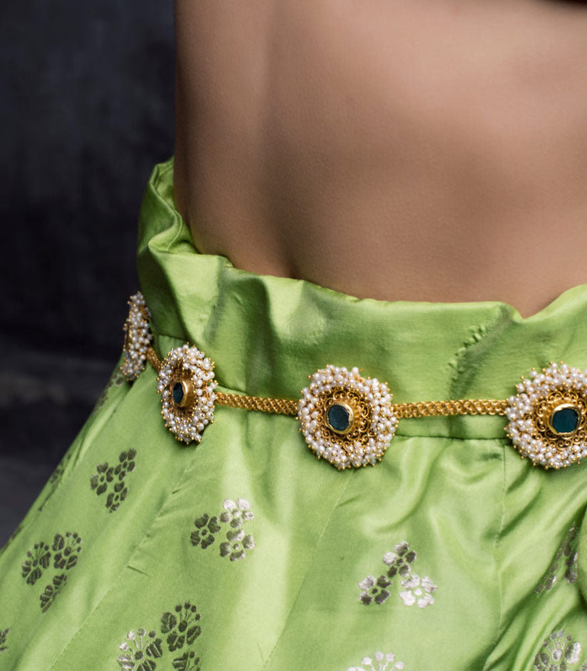 Ethereal pastel bridal outfits are beautifully complemented by the trending choice of green and pink jewelry. Opting for emerald green jewelry with a pastel pink lehenga creates a striking contrast, adding a touch of sophistication and allure to the bride's look. This unconventional yet stylish combination allows modern brides to infuse their bridal ensemble with a unique and enchanting appeal, making a memorable statement on their special day.