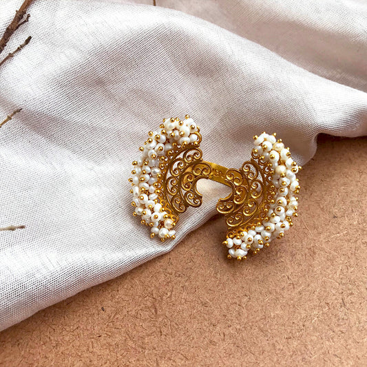 Maang tikkas are head jewelry commonly worn by Indian brides from various states and communities. To match your maang tikka with the rest of the jewelry, you can opt for our pearl bridal jewellery set which includes matching headwear. Whether you want minimalist designs or heavy work on your maang tikka, you can find all variants at Zariin. Another type of head jewellery that you can choose is a matha patti, many of which have pearl beads embellished on them.