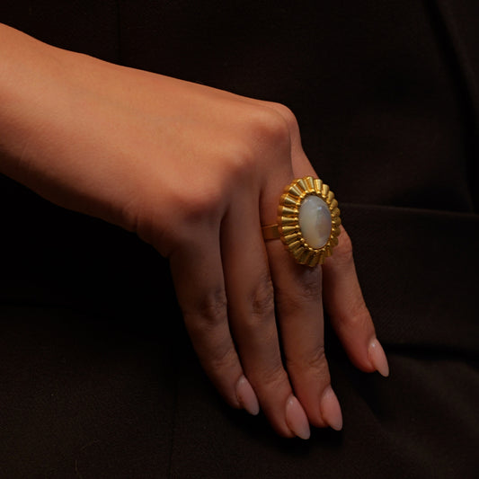 The collection is inspired by captivating coastal landscapes and elements of the ocean that blend the vibrant blues of the sea with lush green vegetation and golden glow of the sand. The gold plated jewellery uses gemstones like Pearls, Turquoise, Malachite and Garnet to justify the luminous coastal colour palette. Curved designs with soft or organic shapes lend fluidity to the pieces making them easy to wear. Some pieces also use coins embossed with a lion to represent power, personal milestones and adventures garnered as you shine on in your journey.