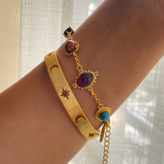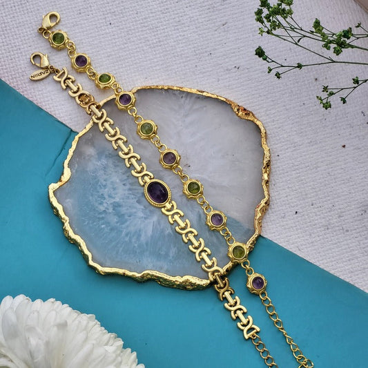 Zariin’s exquisite collection of stone hand bracelets, cufflinks, and fancy bangles is a joy to share. Made from raw, uncut, and 100% original gemstones like Citrine, Rose Quartz, Amethyst, and Blue Chalcedony with 22kt gold plating on brass, these bracelets will add glamor to your Diwali look. Crafted for both “him” and “her”, our crystal healing stone bracelets are meant to elevate positivity and joy in your lives, while uplifting your overall look too.
