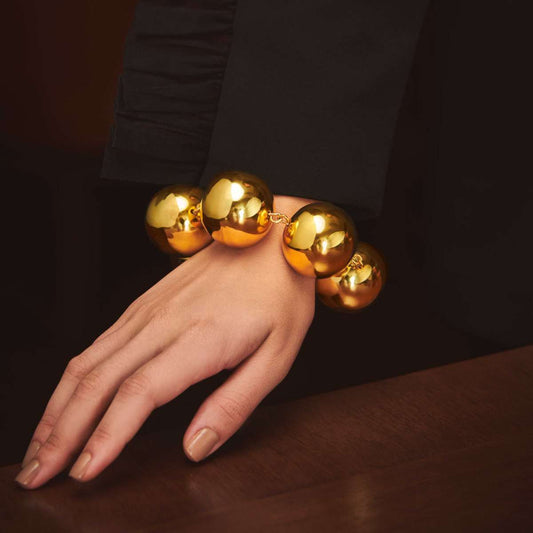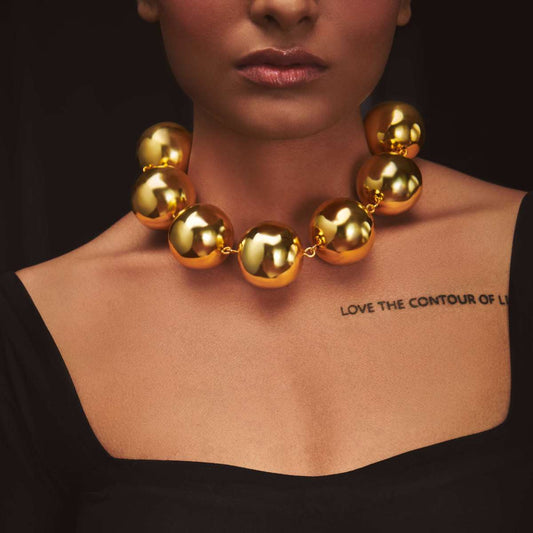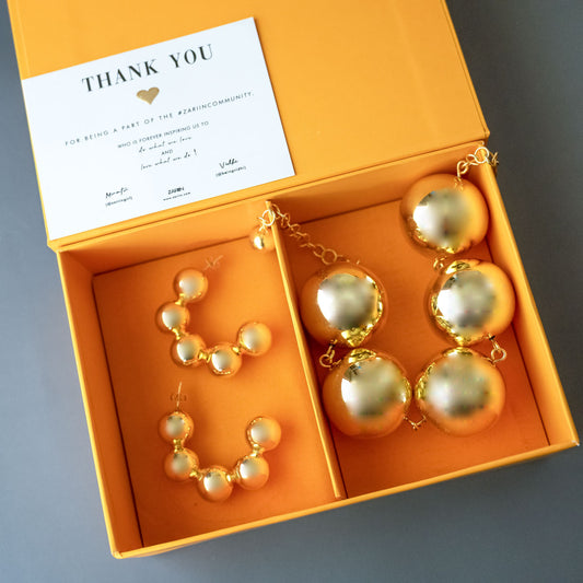 Shiny Disco Balls is a party wear jewellery collection by Zariin with bold, trendy, statement jewellery. It is a collection crafted of oversized, high gloss finish golden balls that combines futuristic aesthetics to a retro vibe, all with a dash of realism.