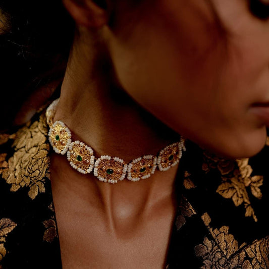 We create online bridal jewellery designs that are 22kt gold-plated to match your taste and make you shine like never before. The filigree work ensures that your bridal attires are adorned with intricate detailing. The addition of precious pearls and stunning motifs provide an undeniable charm to your designer Pearl Wedding Jewellery .
