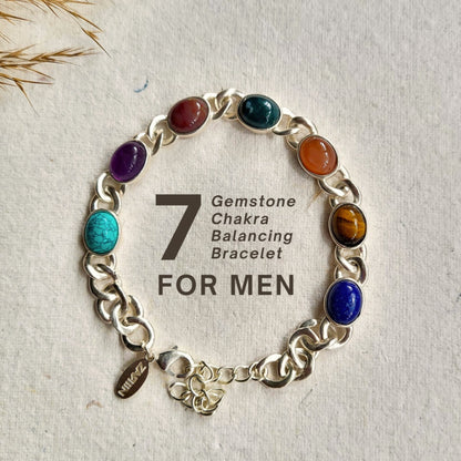 Elevate your style with this rugged yet refined 925 silver plated link chain bracelet, featuring 7 powerful healing chakra balancing gemstones proven to promote confidence, strength, and balance.