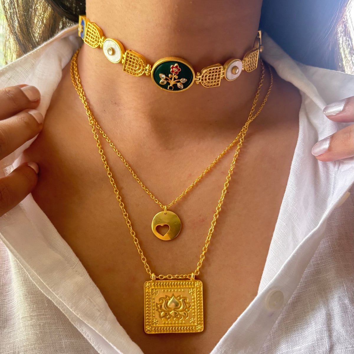 Layering your necklaces adds a visual depth to your look. Achieve the right combination by mixing lengths, textures and types of necklaces. In this combination, we have combined a choker necklace with two different pendant necklaces. The common thing that binds the visibly different necklaces together is the common tonal look of 22kt gold plating.