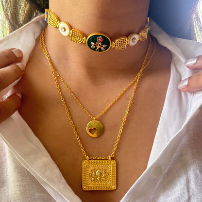 Beauty in Chaos Lotus Necklace - The look is finished with a tablet pendant detailed with lotus motif. It further adds to the story telling as lotus is a symbol of transformation and inspires us to blossom into something amidst the chaos of murky, muddy waters.