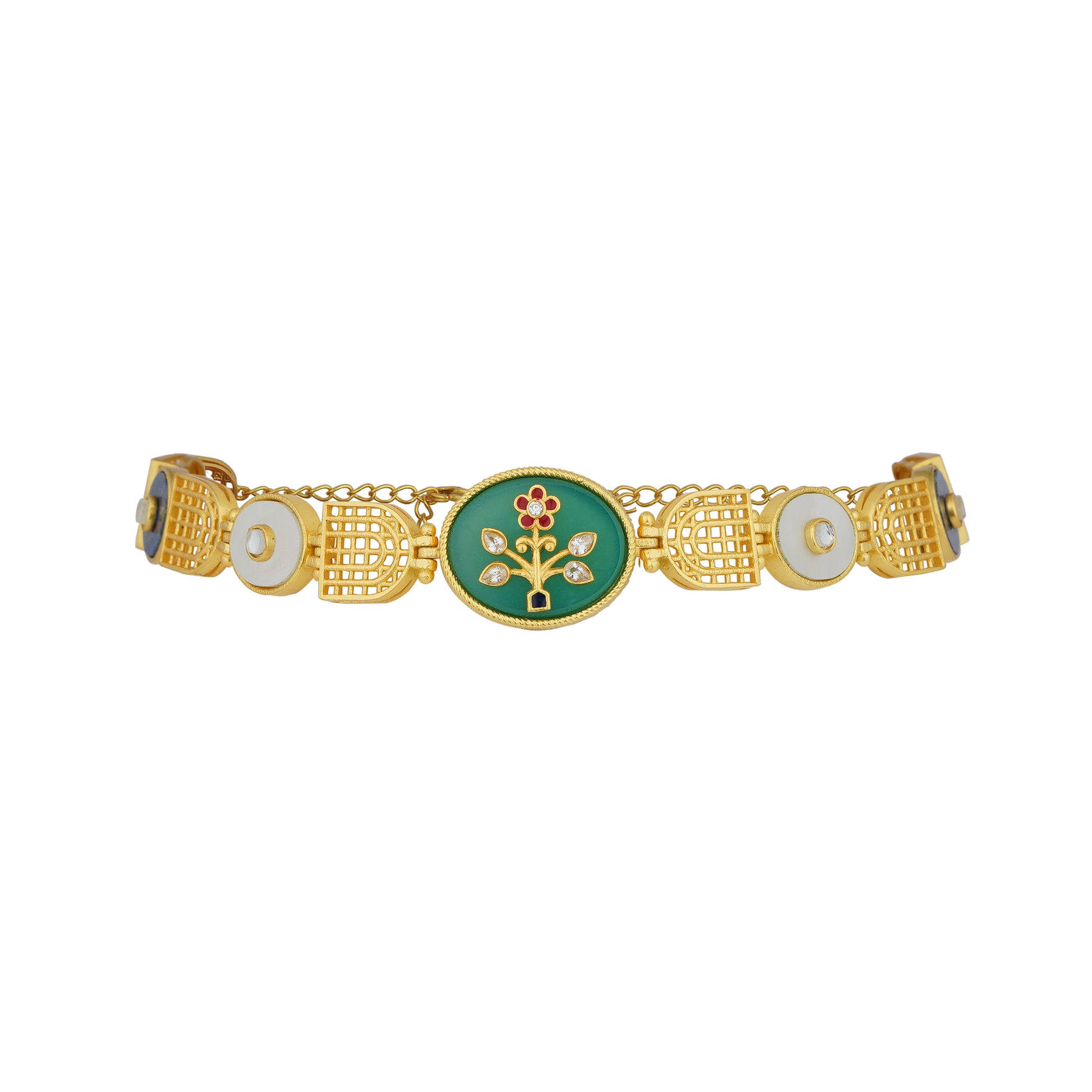 • Glory of Tradition Choker Necklace - The modern choker is crafted with ancient crafting technique of Holdali. Intricate filigree motifs in combination with discs of Green Onyx, Lapis Lazuli and Mother of Pearl are brought to life with elegant motifs crafted with Holdali technique. Red and Blue enamel with Zircons add to the detailing.