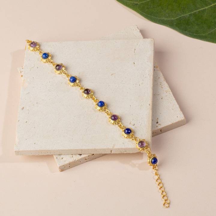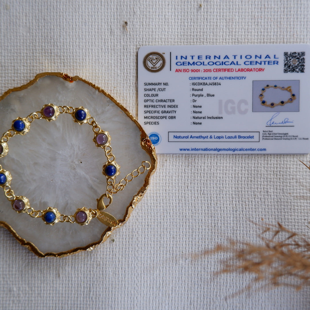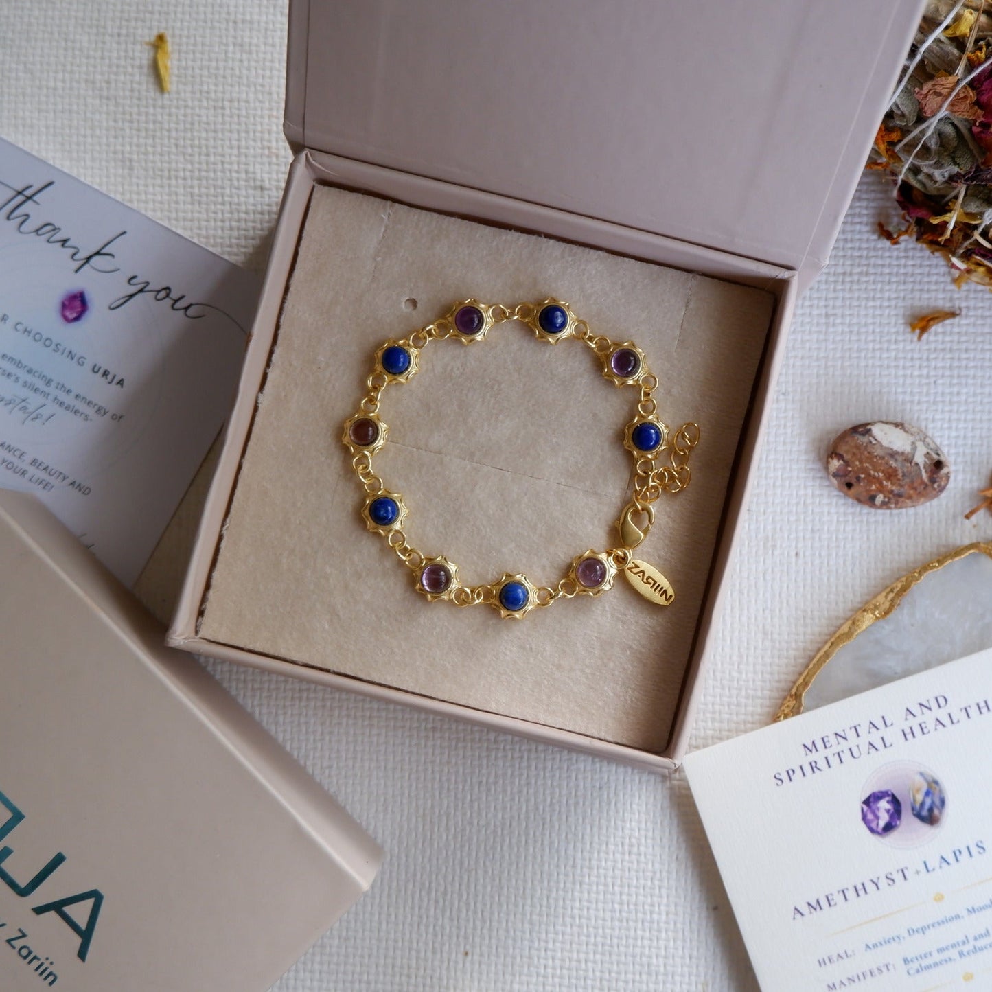 This 22kt gold-plated healing bracelet features Amethyst and Lapis Lazuli, two powerful gemstones that help you manage and ease anxiety. In today's fast-paced world, external pressures like constant connectivity, social media, and the overwhelming news cycle can heighten stress, leading to both mental and physical health issues.
