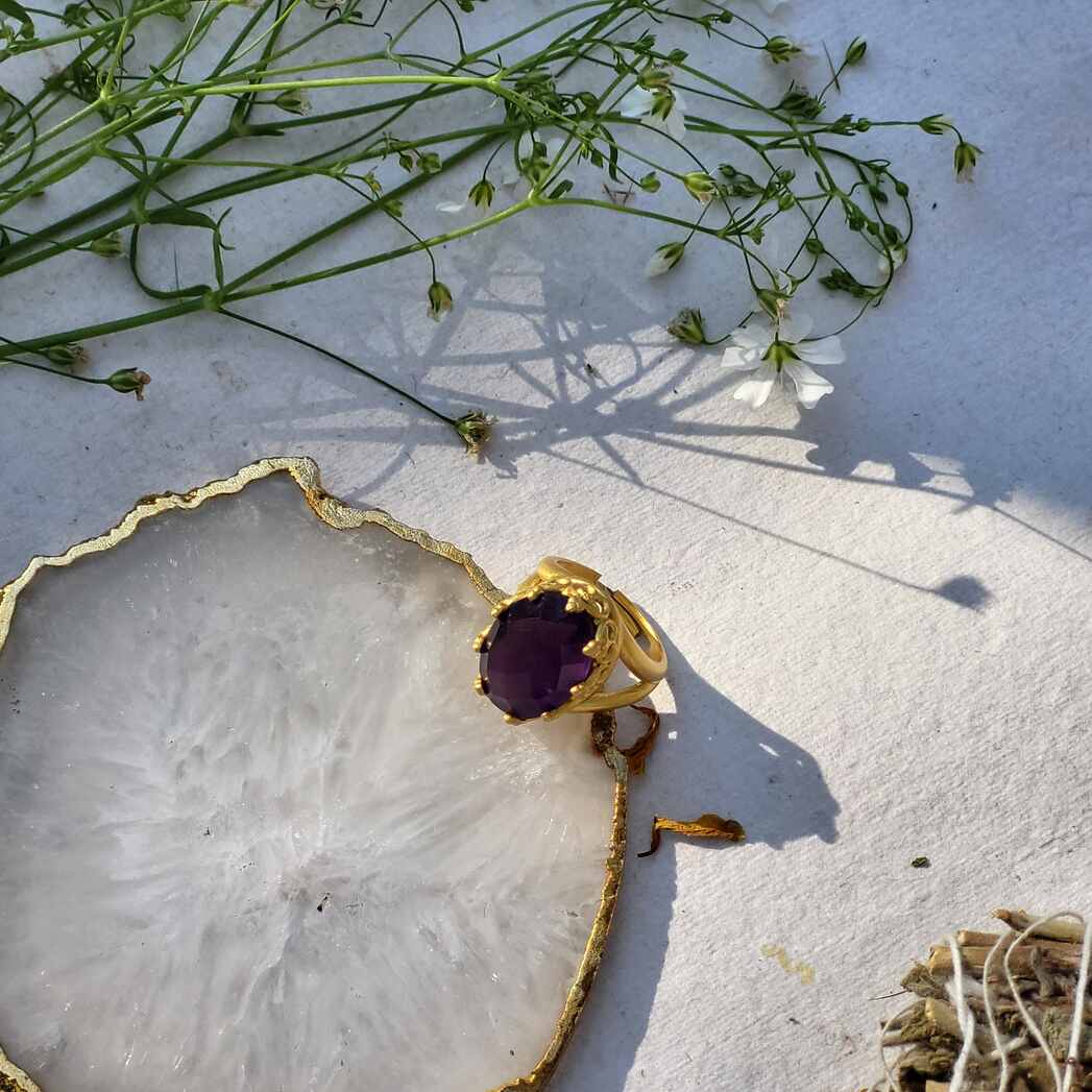 This elegant 22kt gold-plated healing ring features a faceted Amethyst in an oval shape, set with finely detailed prongs for a vintage feel. The bold Amethyst stone, with its deep purple hue, is known for its calming properties and stress-relieving qualities. Wearing this ring helps bring tranquility to your mind and body, easing anxiety and stress, and promoting overall well-being. In today's fast-paced world, where stress and anxiety are common challenges, this ring serves as a reminder to find calm and balance in your life.