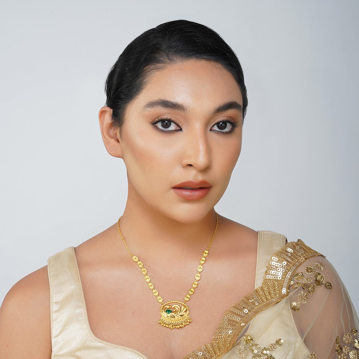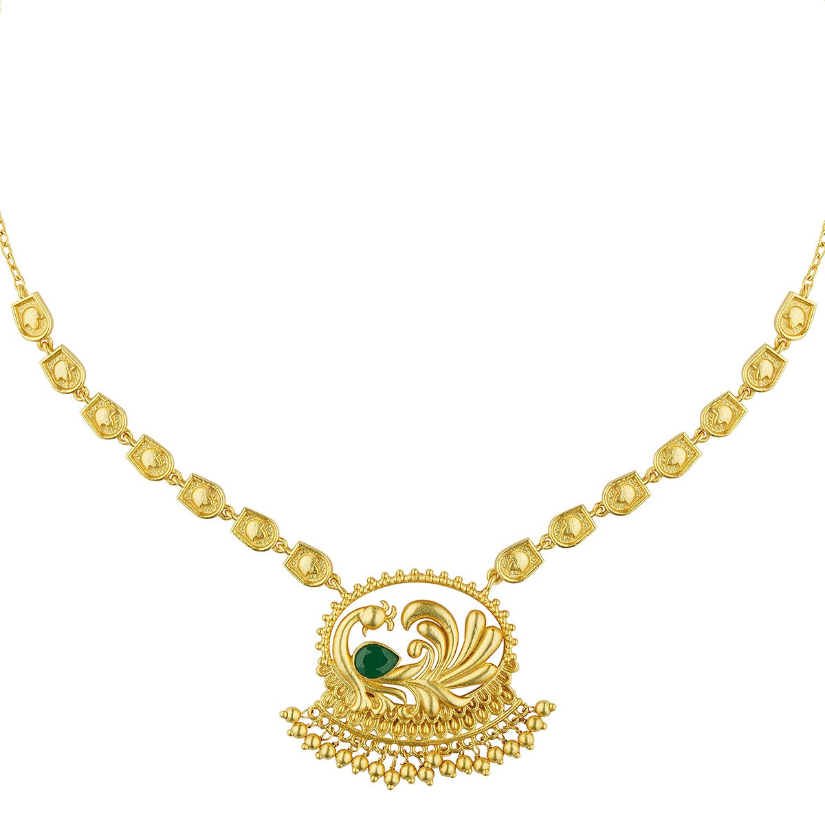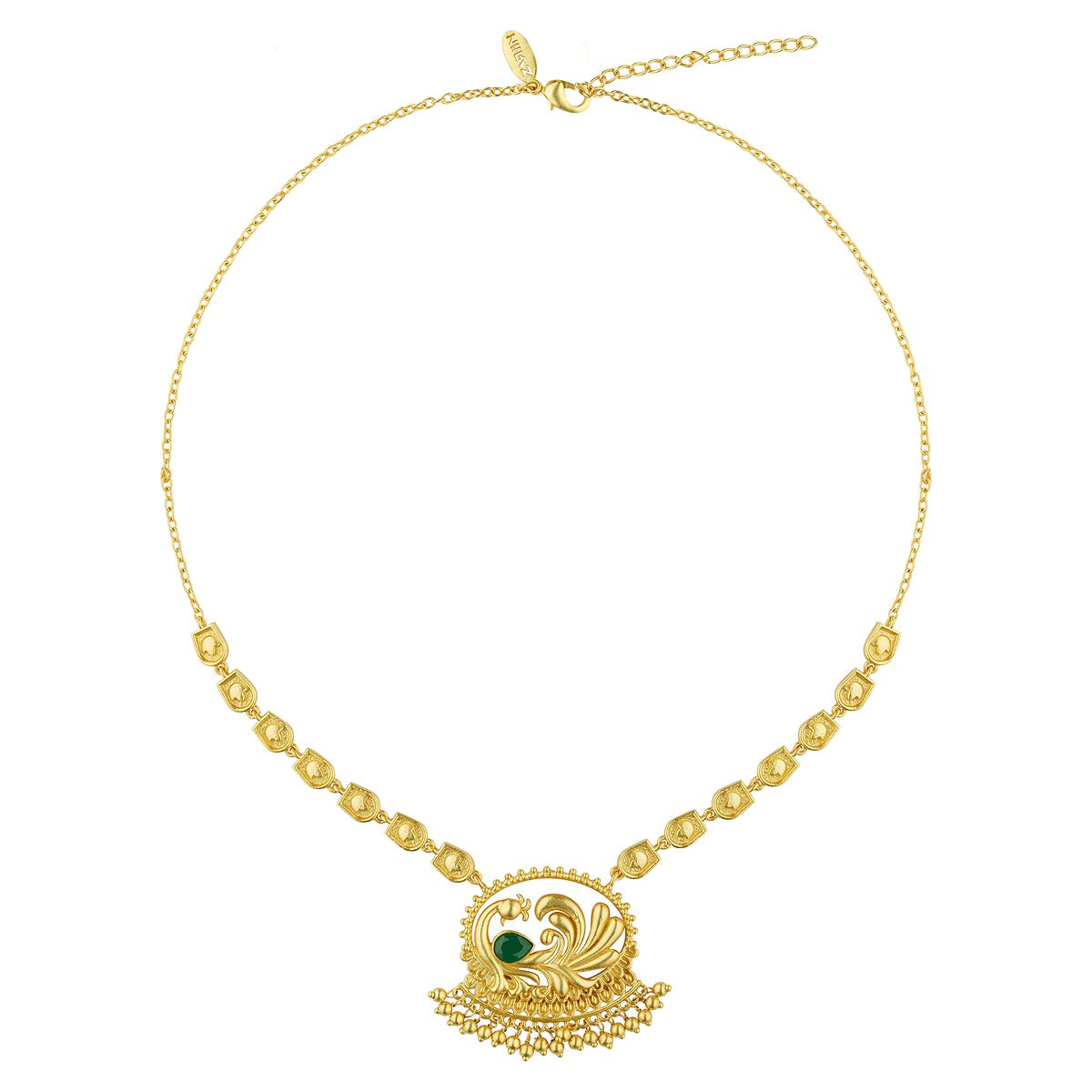 This is a refined 22kt gold plated pendant necklace inspired by the classic Indian temple jewellery. The striking necklace features beautifully embossed motifs of the majestic elephant and much revered lotus buds. Both the symbols are cherished in the Indian subcontinent for wisdom, prosperity, spirituality and divine beauty. Crafted skillfully using metal embossing technique, the necklace is well detailed and celebrates texture which is typical of the antique temple jewellery. Pair the piece with a classic saree or a chic blouse and crisp trousers for a contemporary twist.