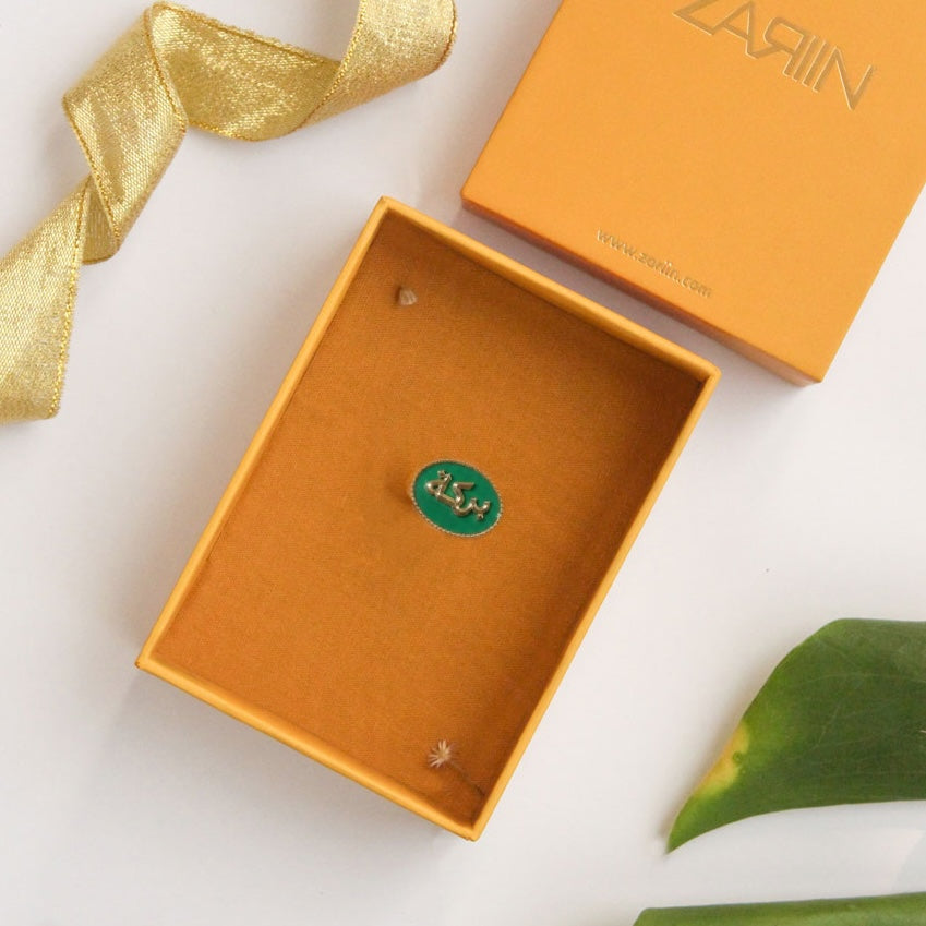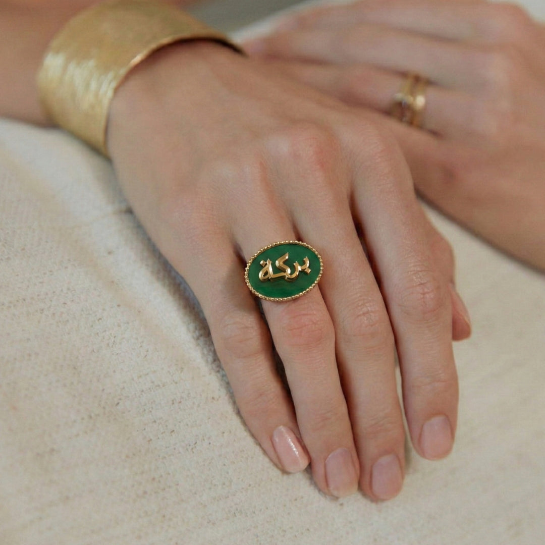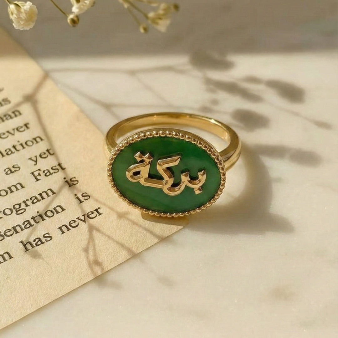 This statement ring features the sacred word Barakah — a symbol of divine abundance — intricately crafted in 22kt gold plating and set upon a polished green onyx stone. The warmth of gold against the deep green creates a striking harmony of richness and serenity.