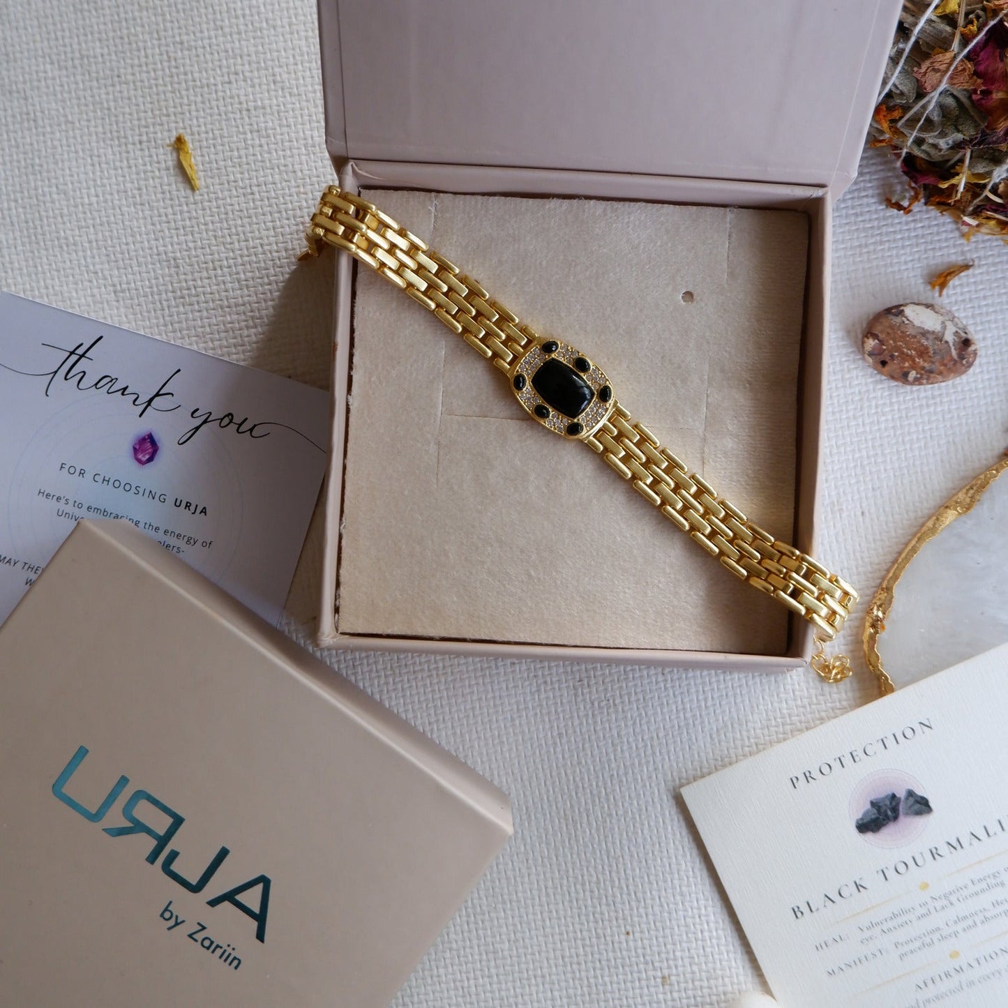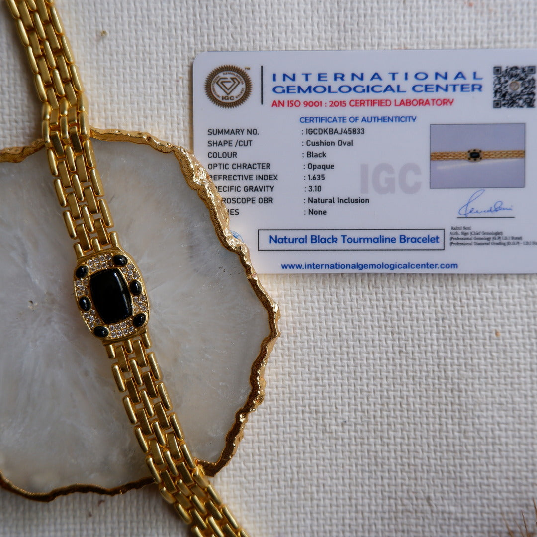 The unisex gold-plated strap combines vintage and modern elements, making it a versatile accessory that effortlessly fits into your daily wardrobe, while allowing you to experience the protective benefits of Black Tourmaline.