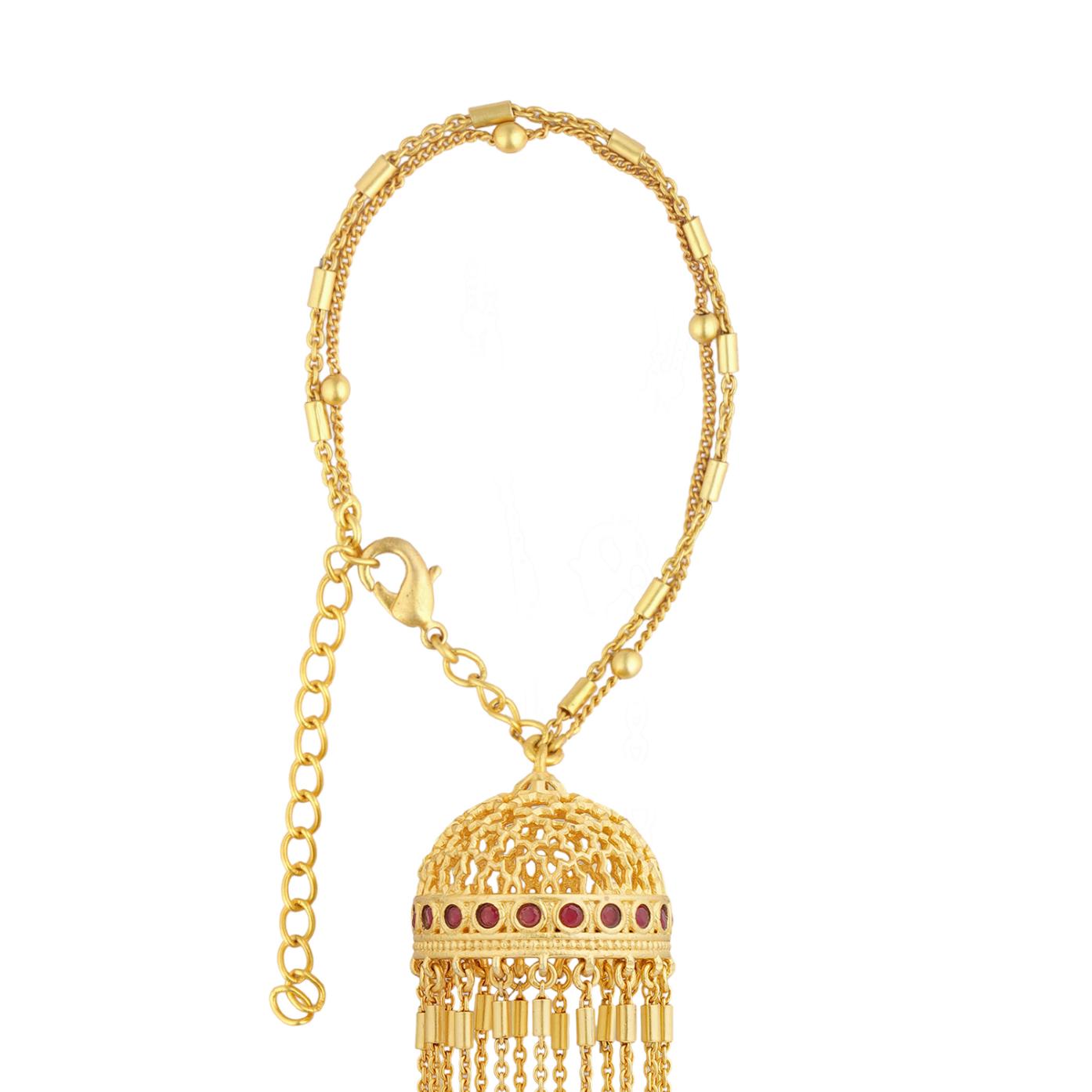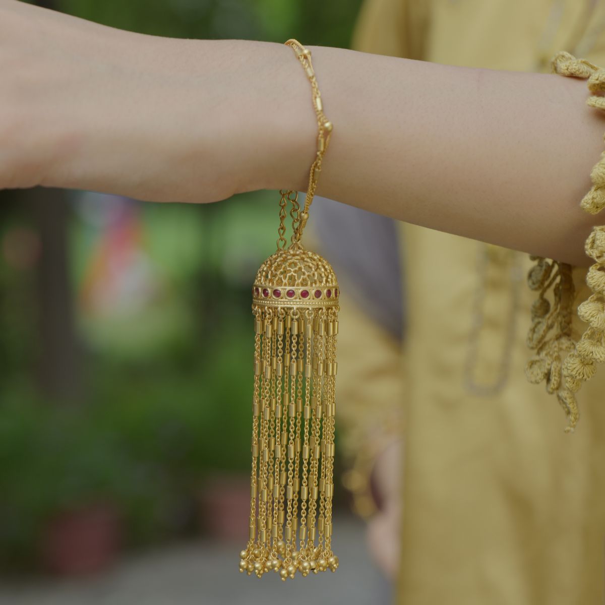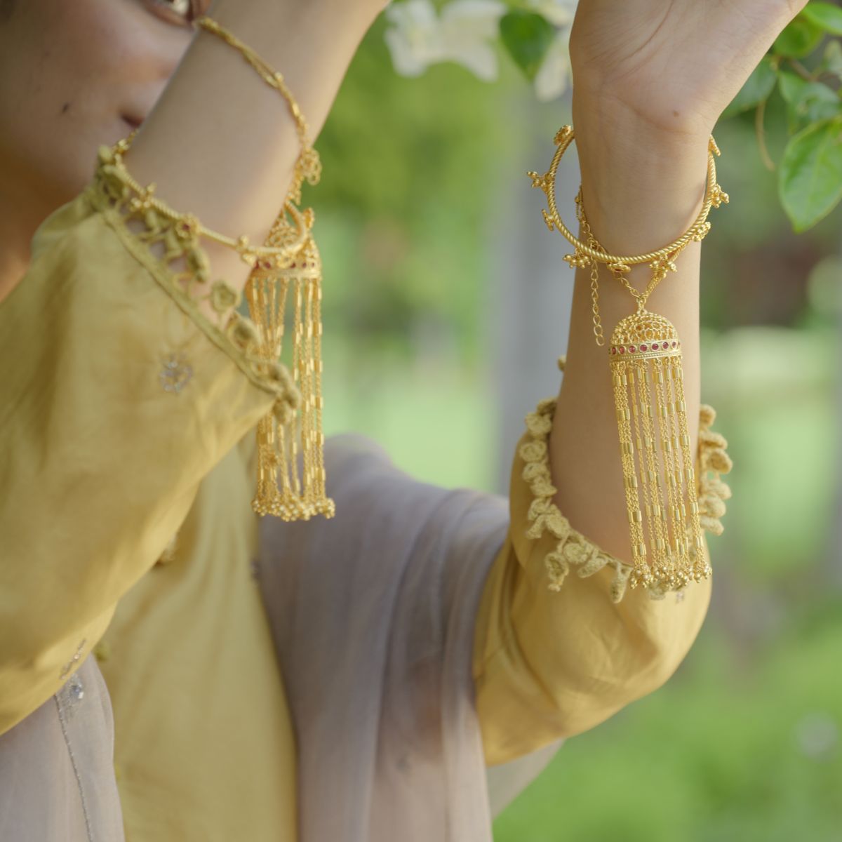 An ode to tradition, reimagined with grace, these 22kt gold plated kaleeras capture the romance of age-old bridal finery with a refined, modern spirit. The elegant double-chain bracelet imparts an ease of wear and leads to a beautifully crafted filigree dome, studded with Ruby Red cubic zircons that add a warm, regal glow. From its base flow delicate drapes of chains, each ending in golden beads that sway gently with every movement — a poetic play of light, sound, and tradition. Perfect for brides who wish to honour heritage while embracing contemporary elegance.