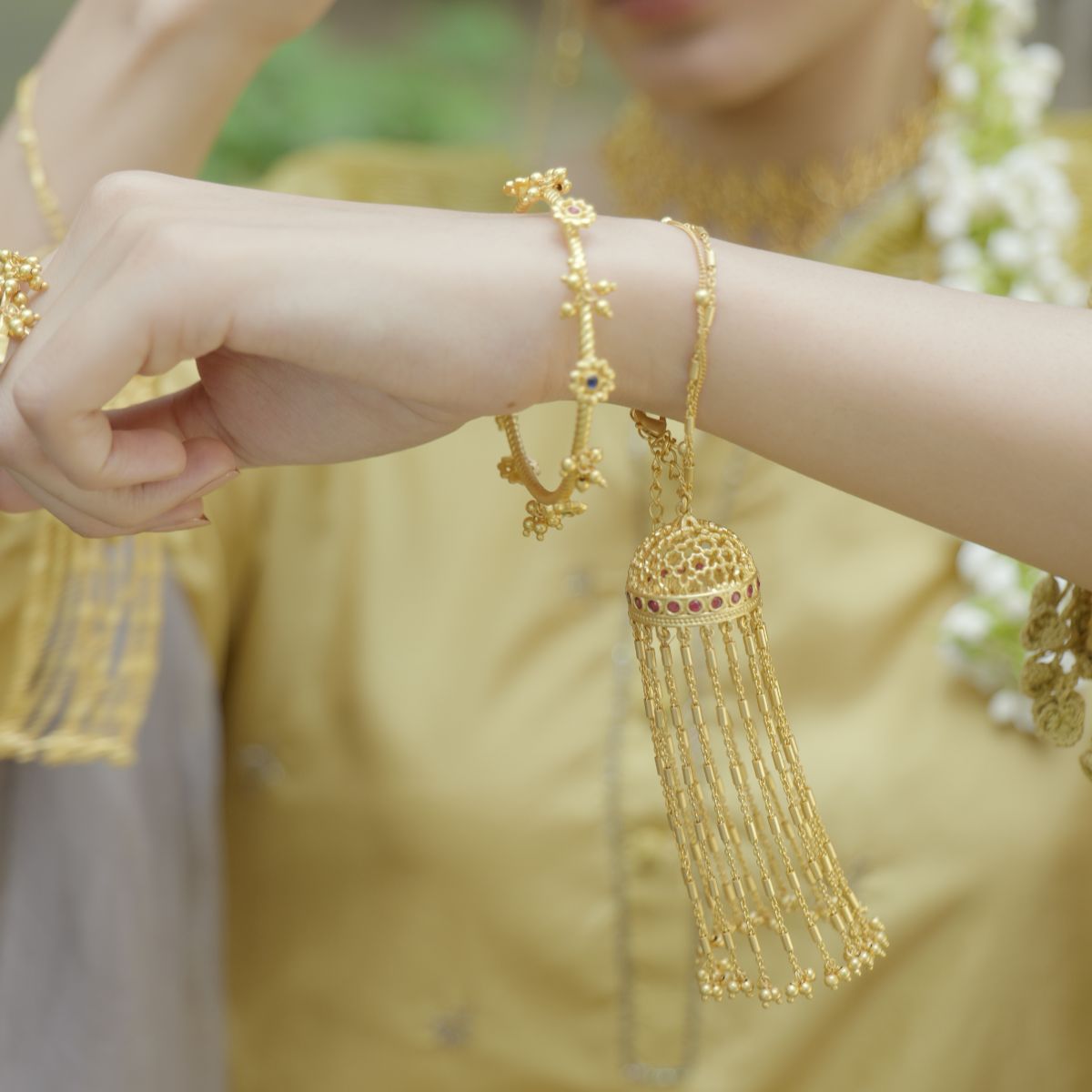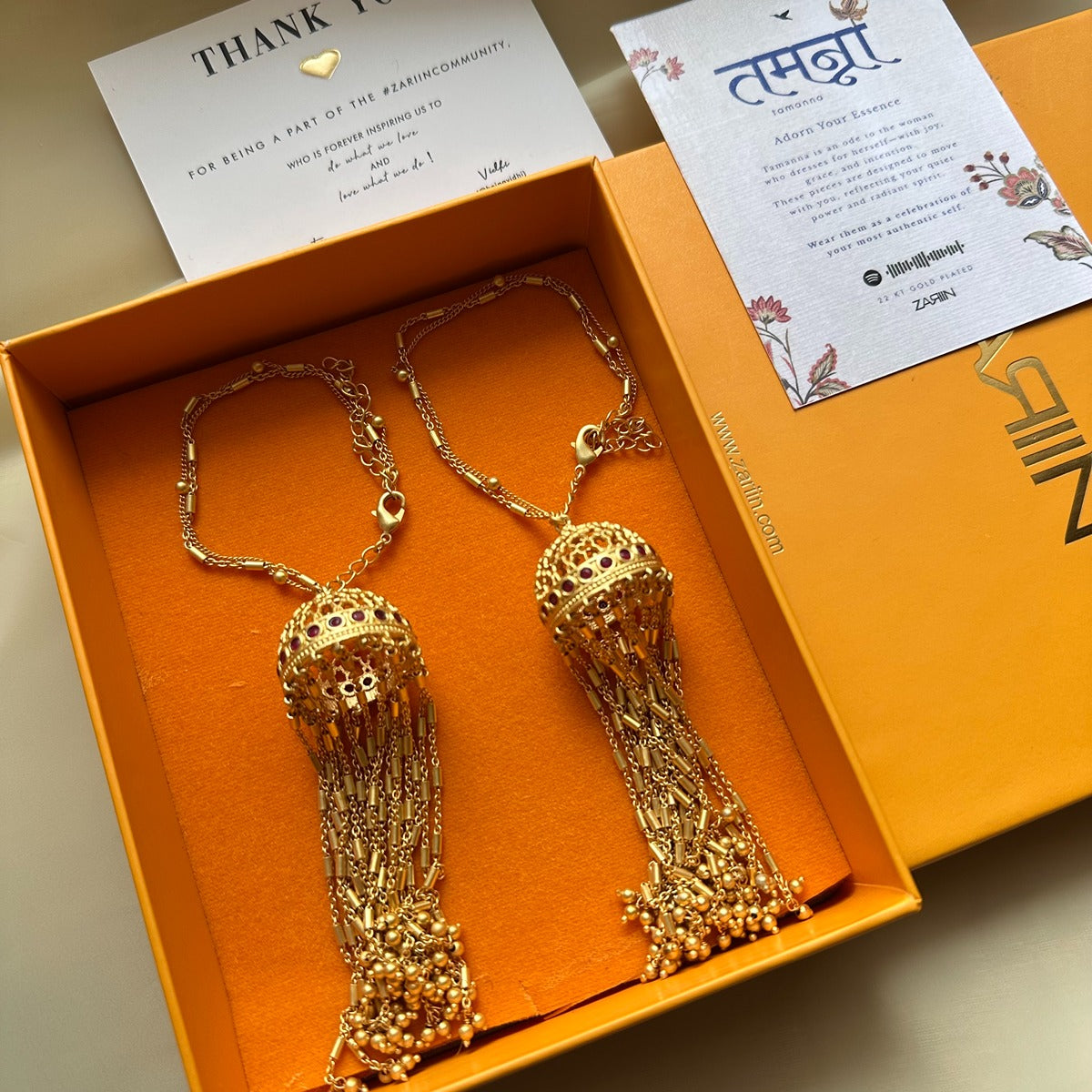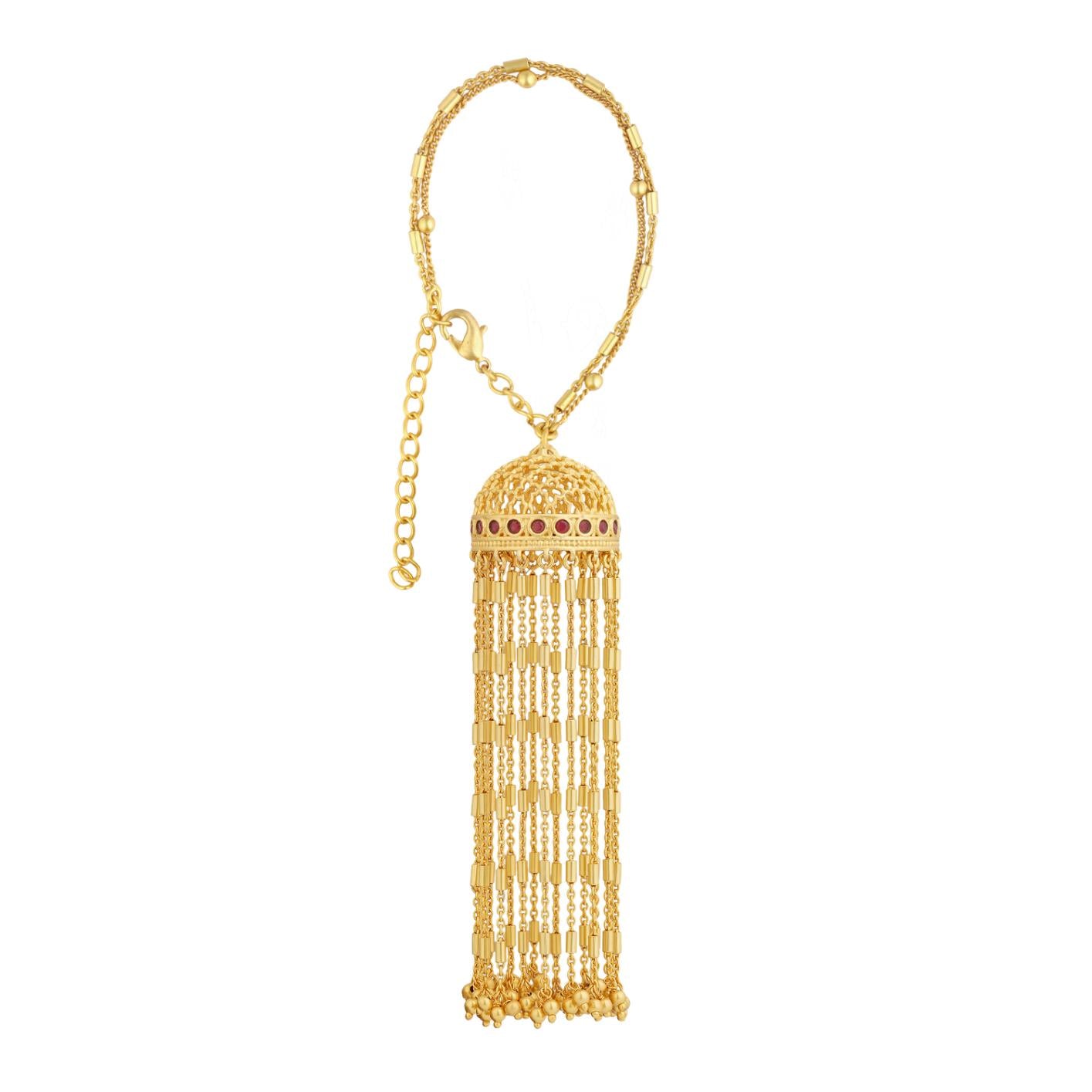 An ode to tradition, reimagined with grace, these 22kt gold plated kaleeras capture the romance of age-old bridal finery with a refined, modern spirit. The elegant double-chain bracelet imparts an ease of wear and leads to a beautifully crafted filigree dome, studded with Ruby Red cubic zircons that add a warm, regal glow. From its base flow delicate drapes of chains, each ending in golden beads that sway gently with every movement — a poetic play of light, sound, and tradition. Perfect for brides who wish to honour heritage while embracing contemporary elegance.