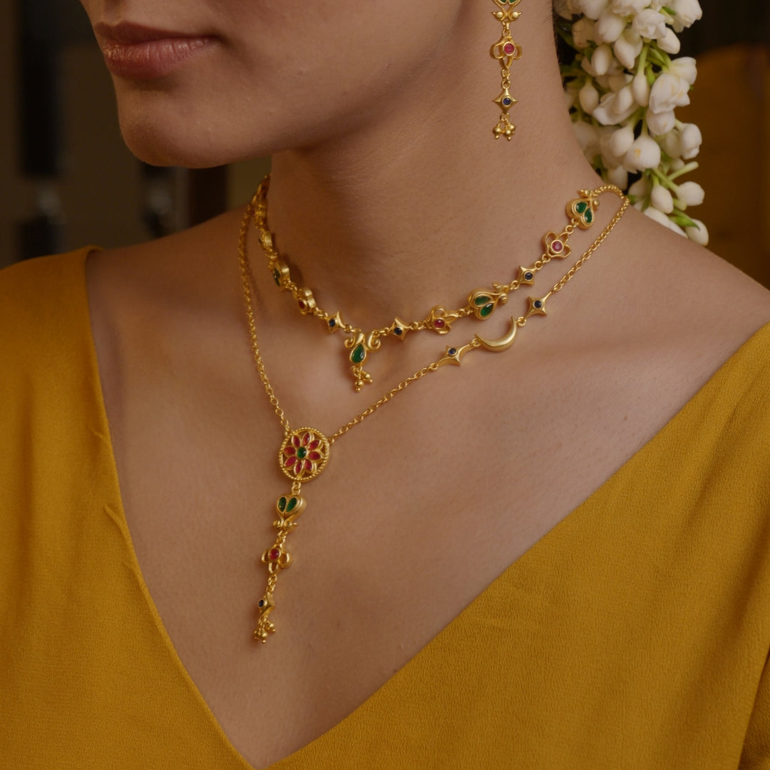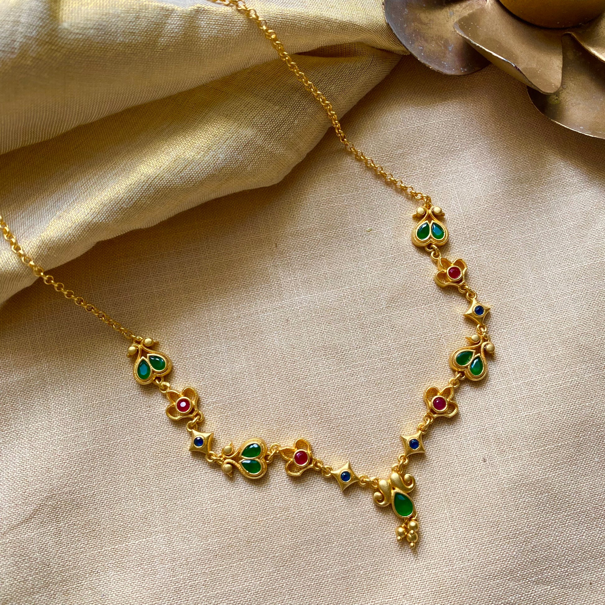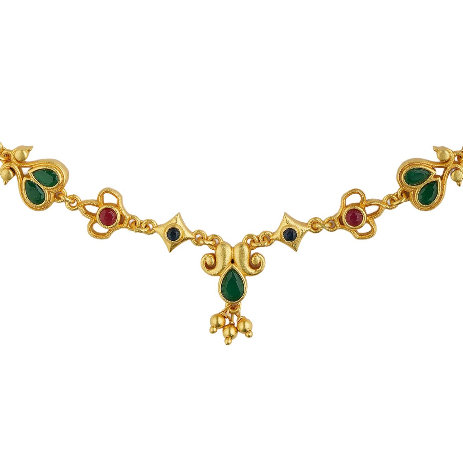 A delicate play of tradition and elegance, this 22kt gold plated necklace features intricately detailed floral and paisley motifs that whisper of heritage with modern ease. The necklace sits lightly, yet makes a lasting impression. Understated yet expressive, this piece adds the right amount of charm to any celebration. Let the necklace shine solo for a minimal look, or layer with longer chains for a more festive, styled up statement. Ideal for intimate weddings, festive brunches, or when you simply want a touch of heritage to your everyday looks. The necklace is studded with Emerald Green, Blue and Ruby Red cubic zircons.