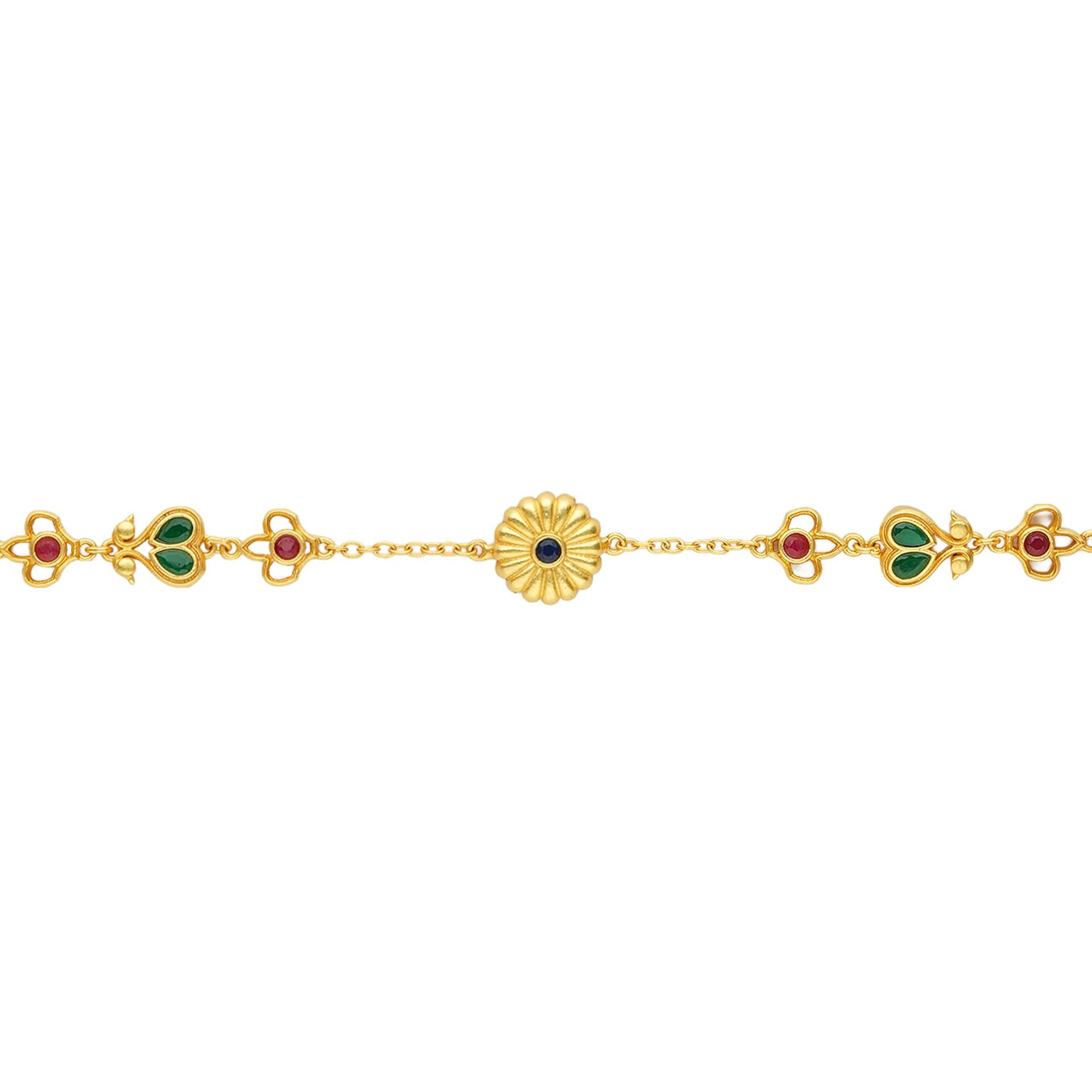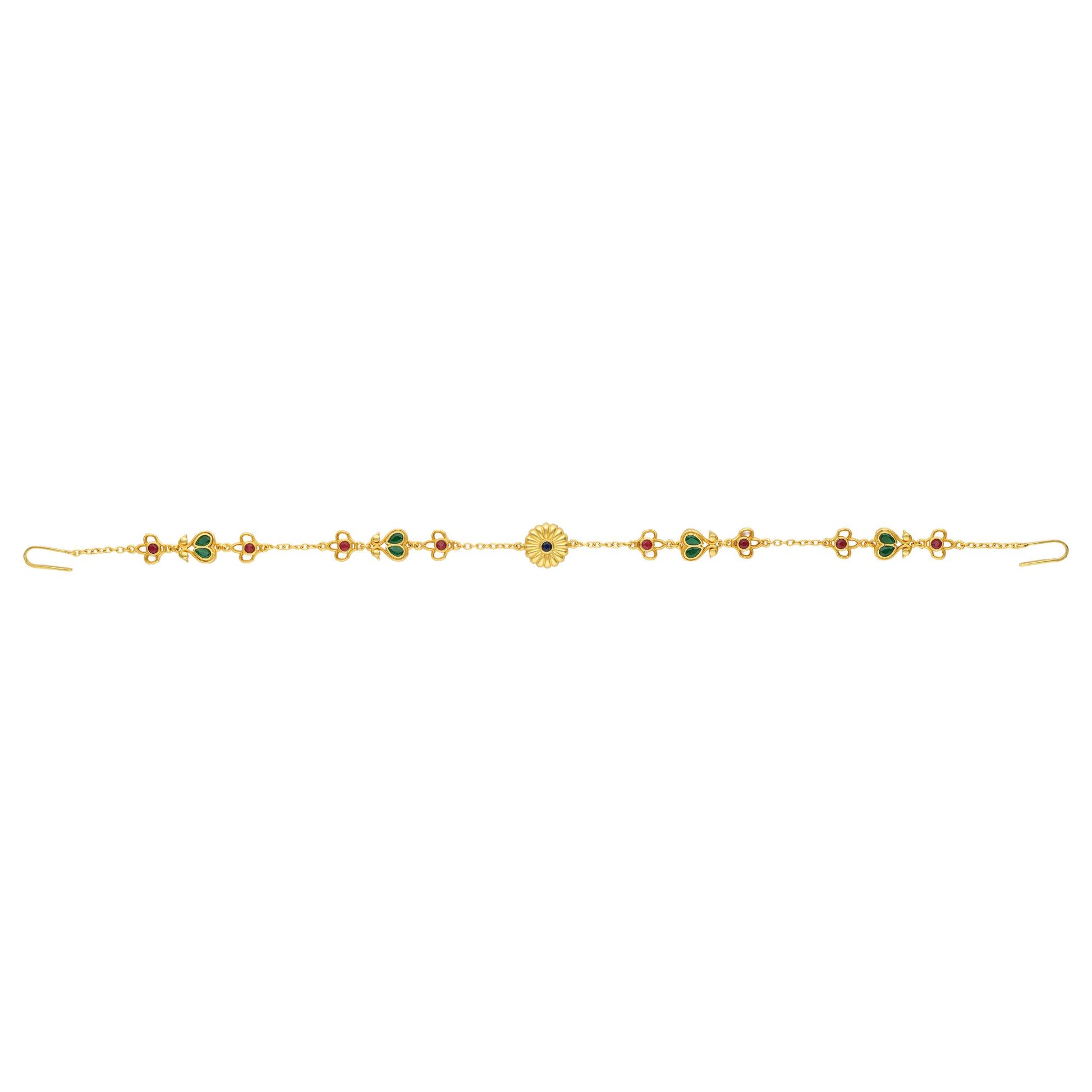 Delicate, graceful and crafted to finish your look with perfection. This 22kt gold plated maatha Patti features intricate floral and filigree motifs brought to life with Emerald Green, Blue and Ruby Red cubic zircons. The vibrant colour scheme lends character depth and versatility that perfectly aligns with festive ensembles. Light and elegant, it’s a subtle yet a striking way to make a statement. Use it to accessorise soft waves, loose bun or a neatly braided updo. The accessory brings a regal touch to your festive ensembles.