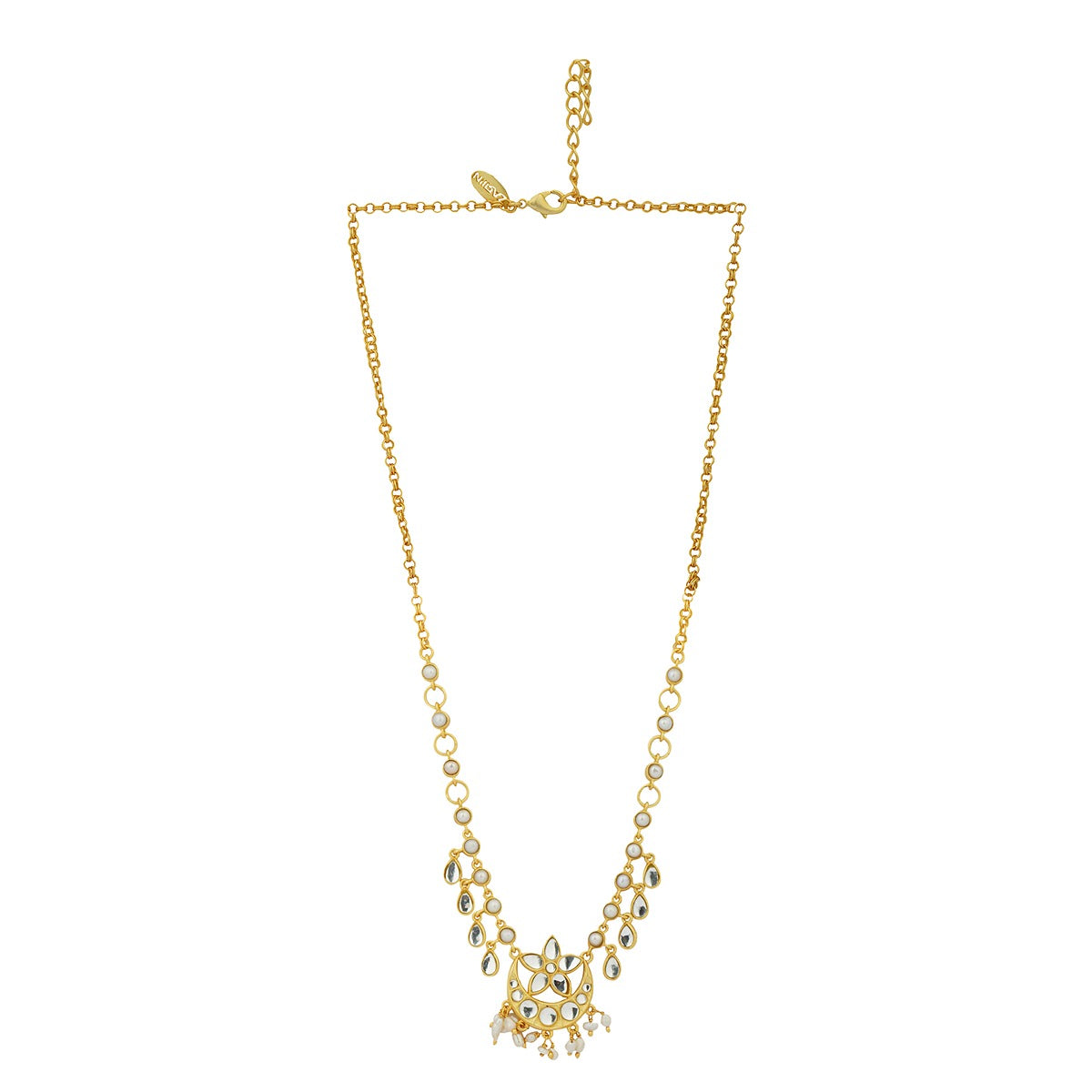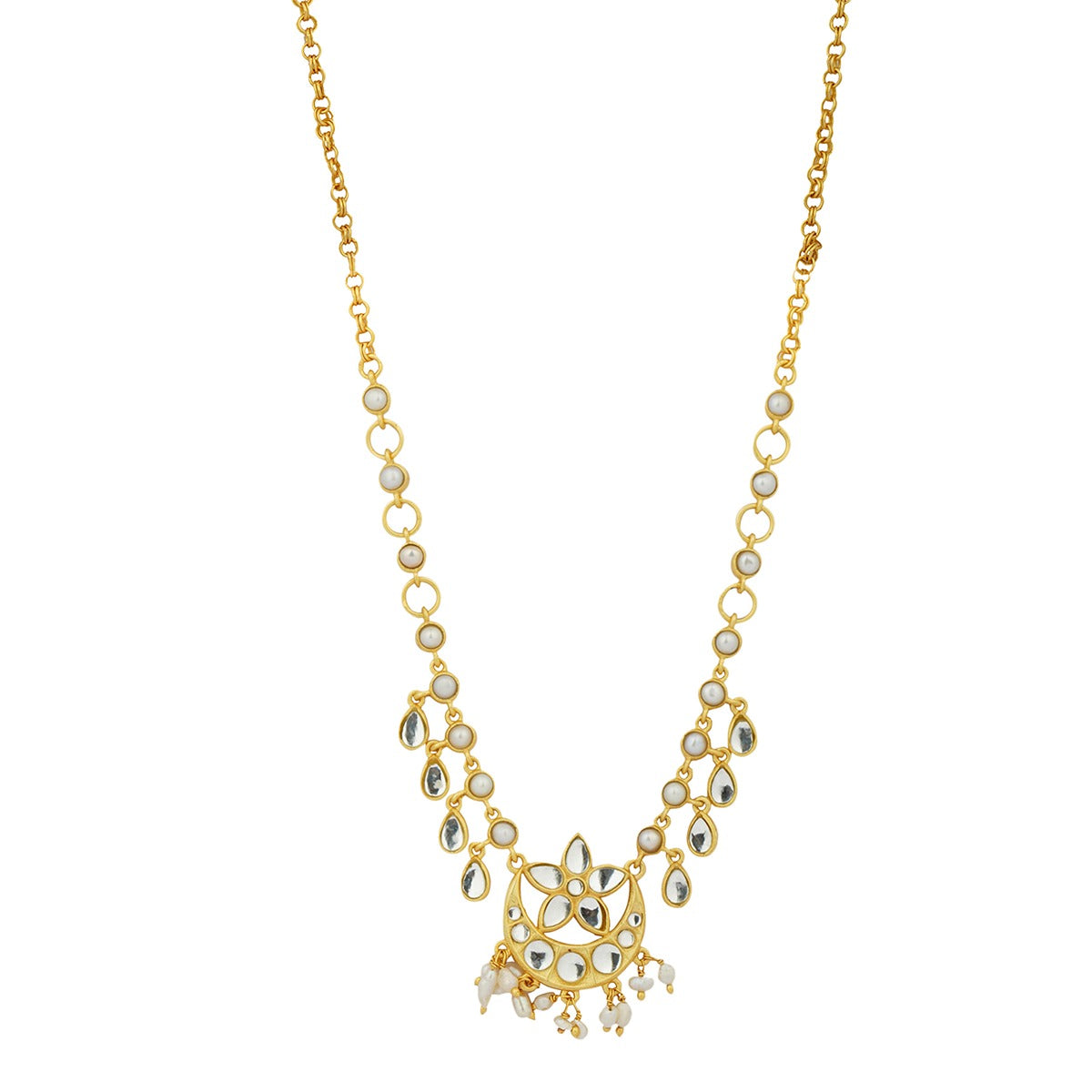 This is a dressy 22kt gold plated necklace intricately detailed with freshwater pearls, teardrop shaped mirror polki drops and is centered with mirror polki chaand phool motif with pearl drops. The necklace is festive, dressy and works wonderfully with your traditional wear or if you want to give an Indian spin to your western outfits.