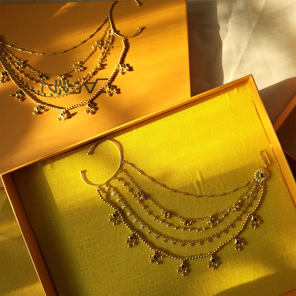 An accessory that transforms your earrings — and your look. This 22kt gold-plated ear hook is a celebration of festive glamour and inventive styling. Inspired by the Kashmiri dejhoor earrings, the piece beautifully bridges tradition and modernity, offering a fresh take on cultural heritage with a touch of contemporary sophistication. Designed to be worn as an add-on with any pair of earrings, it hooks gracefully from the back of your ear, letting five elegantly detailed chains — each unique in texture and design — cascade towards a floral motif. This floral motif hooks onto the back of your head, creating a beautifully draped silhouette that frames your face and hair with effortless drama. A versatile piece that instantly elevates even the simplest earrings, taking them from everyday wear to festive-ready in a heartbeat. The accessory is detailed with Ruby Red and Blue Zircons.