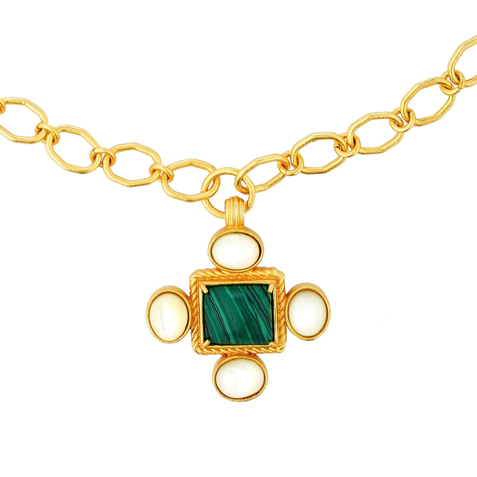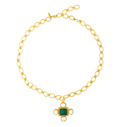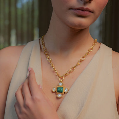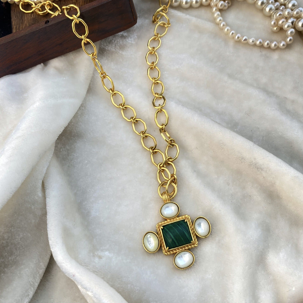 Looking to add a pop of colour to your travel outfit? This striking and versatile, 22kt gold plated link necklace dressed with a Malachite and Pearl pendant is great option to elevate your look. What makes the necklace truly work is its ability to worn casually or formally. Whether you want to lend a personal touch to a casual t-shirt or dress or glam up a formal attire. The necklace is just the kind of accessory the modern traveller is looking for - it’s versatile, it’s unique, it’s practical and eye catching.