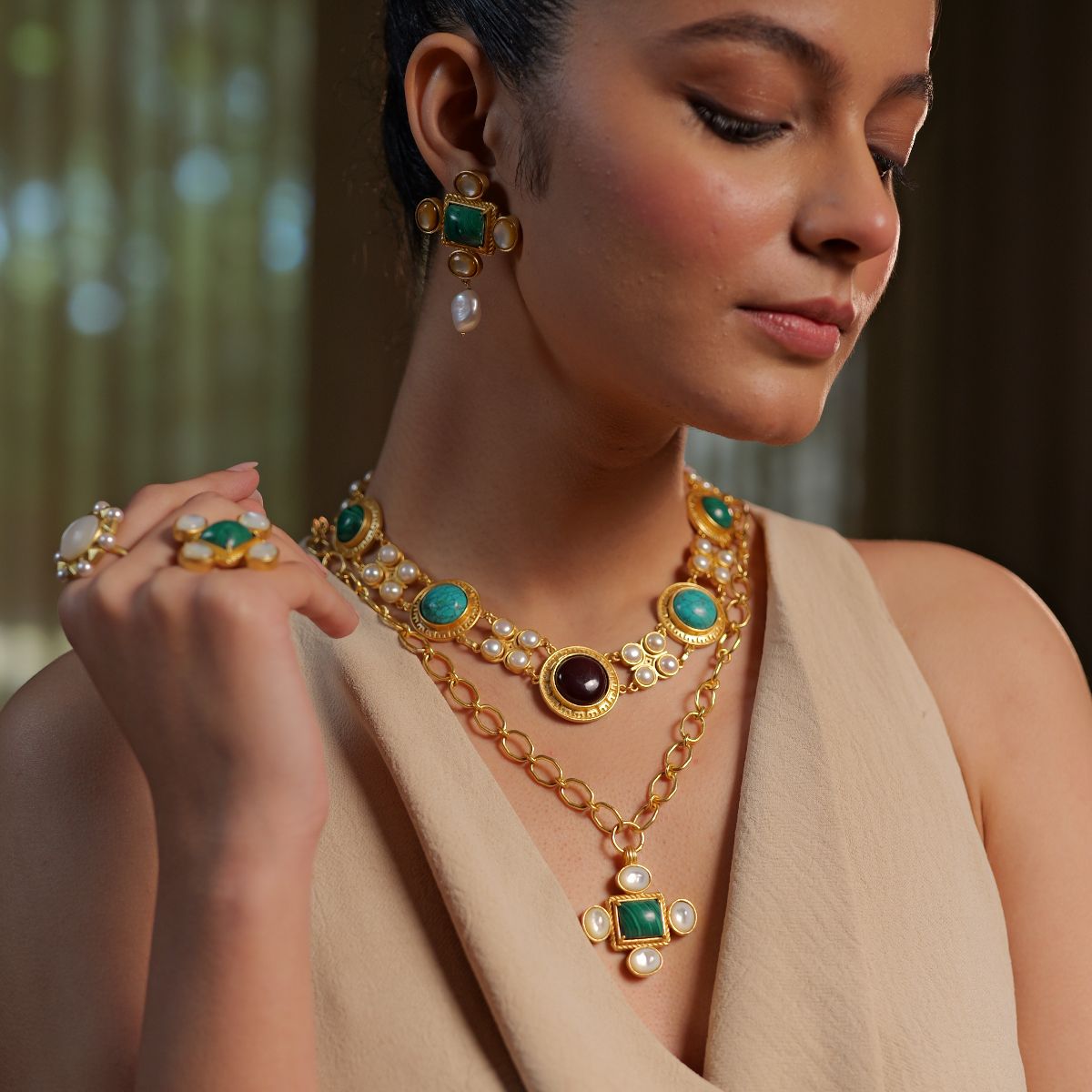 Coast Affair uses vibrant gemstones like Malachite, Turquoise and Garnet which are inspired by the colours of the sea. The collection also uses Pearls and Baroque Pearls which are elements and treasures straight from the ocean.