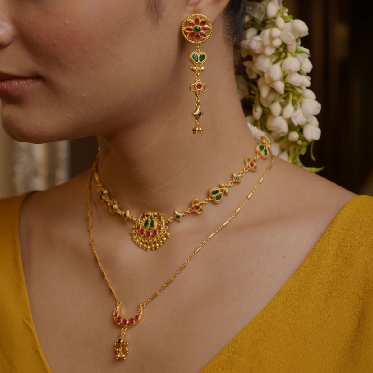 Looking for a curated set that will always look great when worn together? This lovely combination of 22kt gold plated necklace with long pendant necklace is great to play with a layered look. The classic chaand motif is the common element in both the necklace which visually and conceptually ties the look together. Finish your dreamy festive look with a pair of stunning long earrings with floral motifs. The jewellery is detailed with Emerald Green, Ruby Red and Blue cubic zircons which lend a pop of colour to your look.