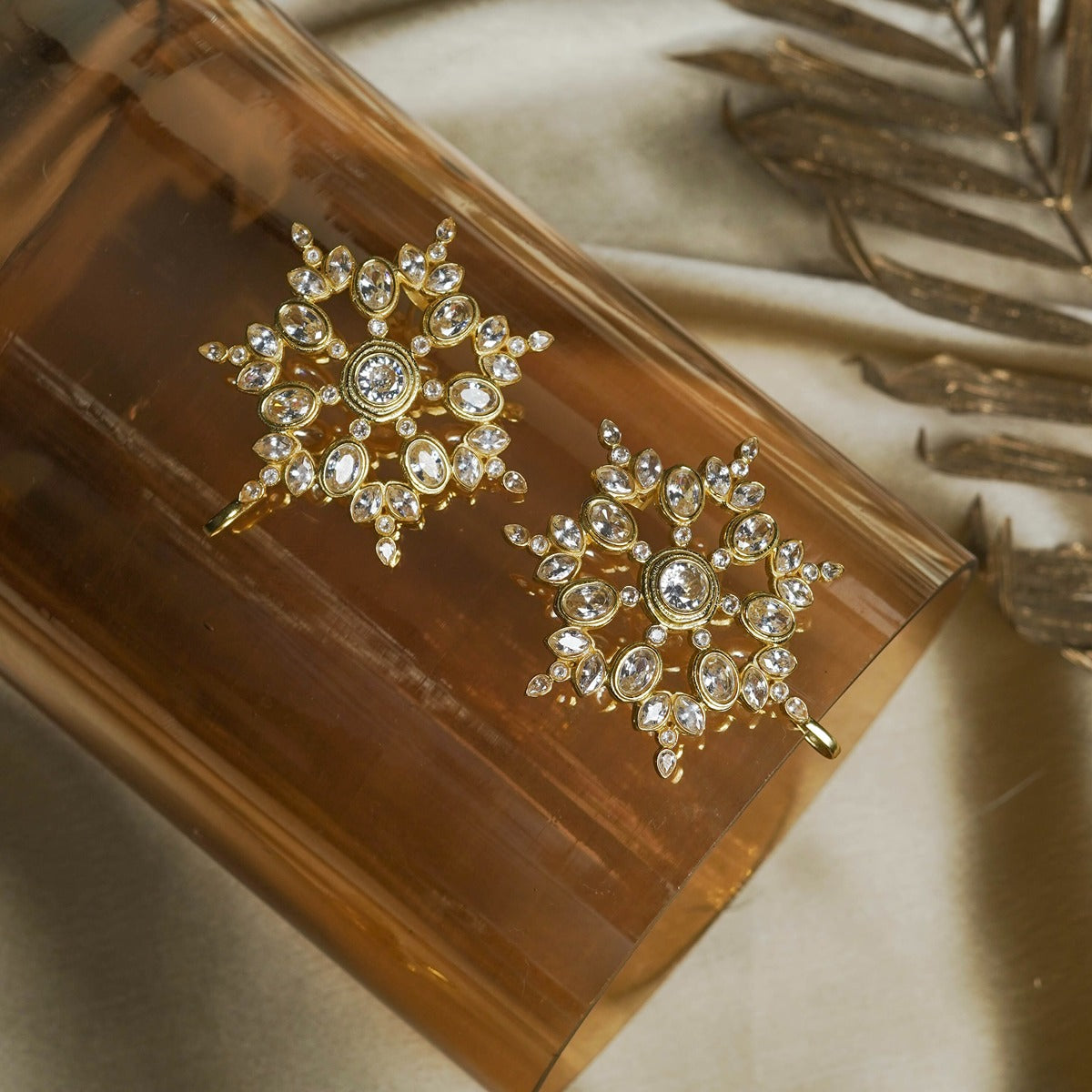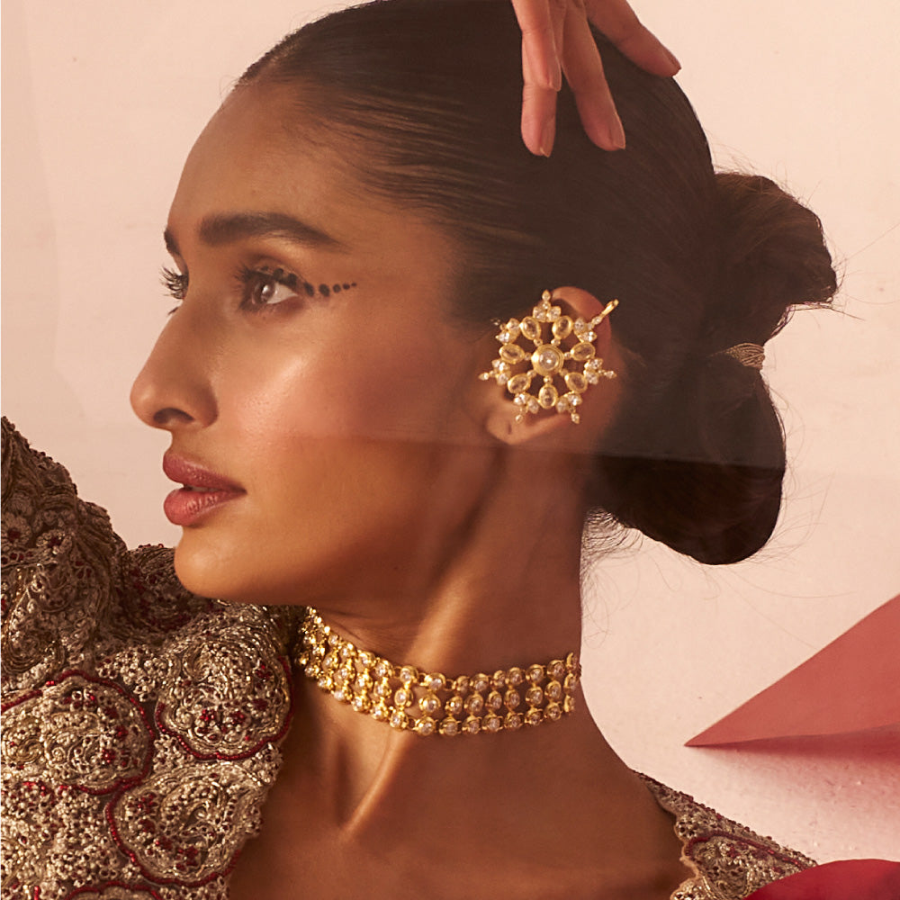 22kt gold plated crystal ear cuffs inspired by a floral motif and set with Cubic Zircons with bezel setting. The ear cuffs are trendy, refreshing, convenient and a perfect accessory to amp up your ear game. This crystal jewellery is a stylish alternative if you want to break out of the classic earring mode and can be adorned even without a piercing. An accessory designed to let you dazzle and make a strong style statement this party season.