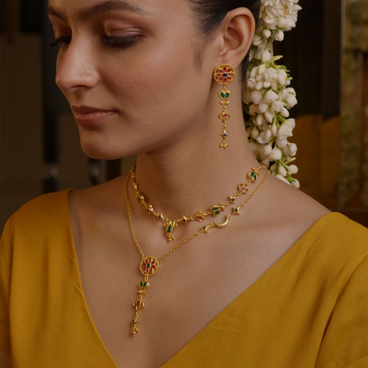 The floral necklace sits beautifully on its own or serves as the perfect base for layering, while the pendant necklace adds depth and drama to your neckline. Completing the set, the long earrings frame your face with elegance and instantly elevate any festive or celebratory look.