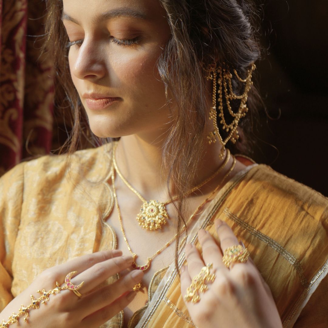 Gone are the days of jewellery that weighs in kilos—pieces you felt obligated to wear, trapped by investment, needing constant justification. Each piece of this collection is rooted in Indian aesthetics by refreshingly fresh, eclectic and light to wear.