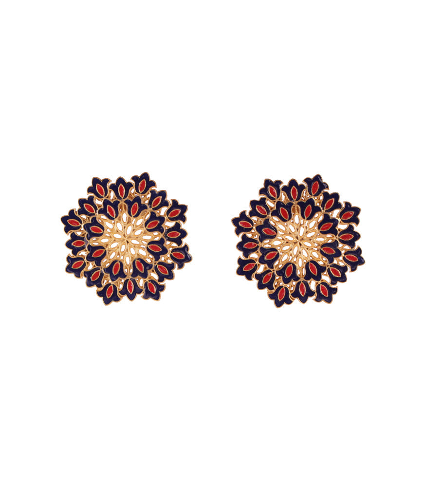 "We are forever crushing on medallion necklaces. The long necklace with the matching studs is interspersed with Enemel floral motifs. The necklace comes in handy every time you have a lot going on your neck or it is dominated by a scarf, dupatta or some work. This also graces your shirts and dresses with a lot of character. The studs are easy adds to any outfit and work as an instant perk up while framing the face.