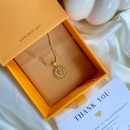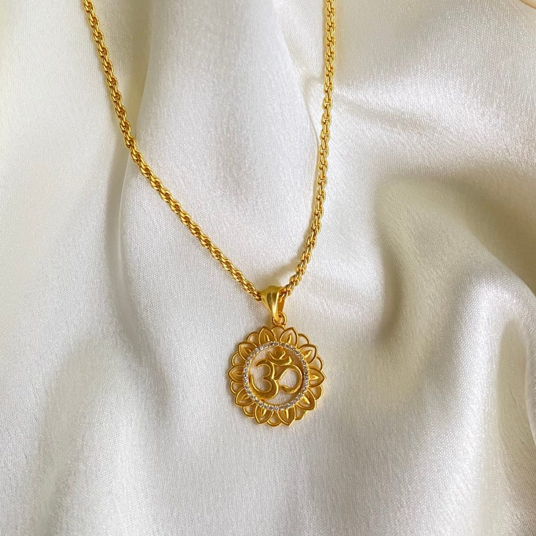 This is a 22kt gold plated Om pendant necklace bordered with delicate filigree details along with a rope chain. It is a beautiful and affordable option for anyone who wants to add some elegant spiritual marker in their daily dressing.