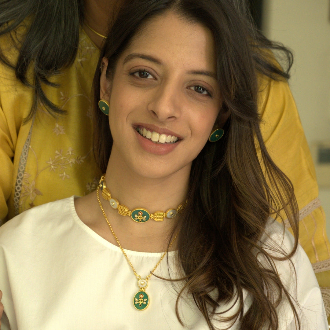 The choker sits gracefully at the neckline, adding structured elegance, while the green onyx pendant necklace brings vintage charm and depth with its rich, regal hue. Together, they create a layered look that elevates ethnic wear, festive ensembles, and bridal styling with unmistakable grandeur.