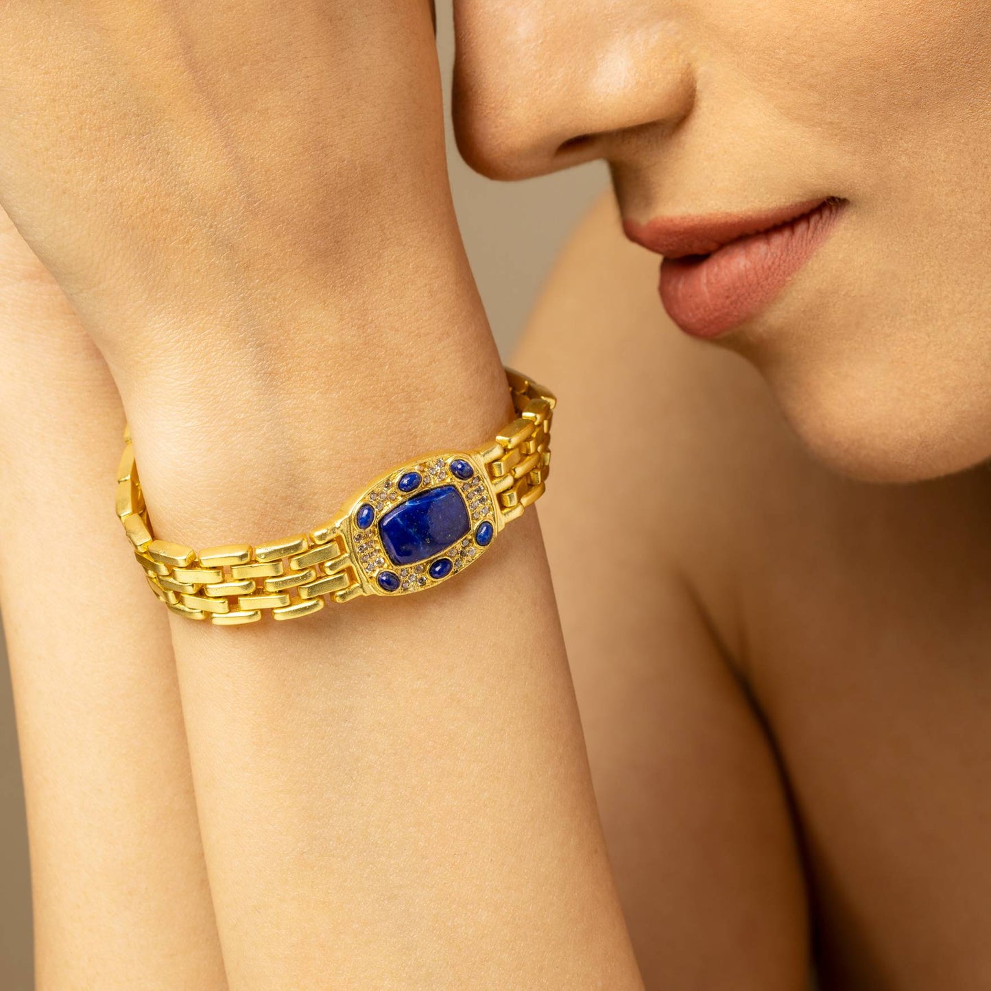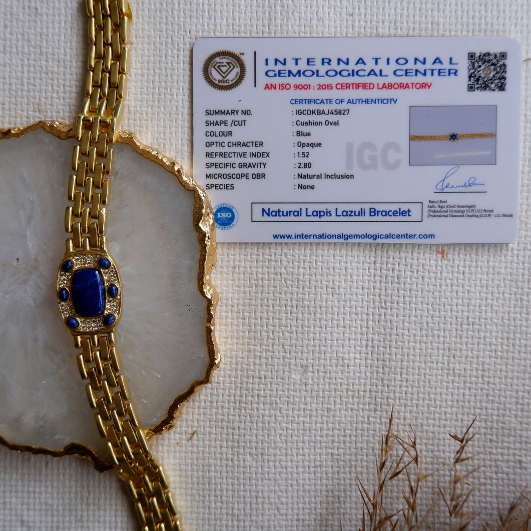 The unisex gold-plated strap offers a blend of vintage and modern styles, making it a versatile addition to your daily wardrobe while providing the calming benefits of Lapis Lazuli throughout the day.