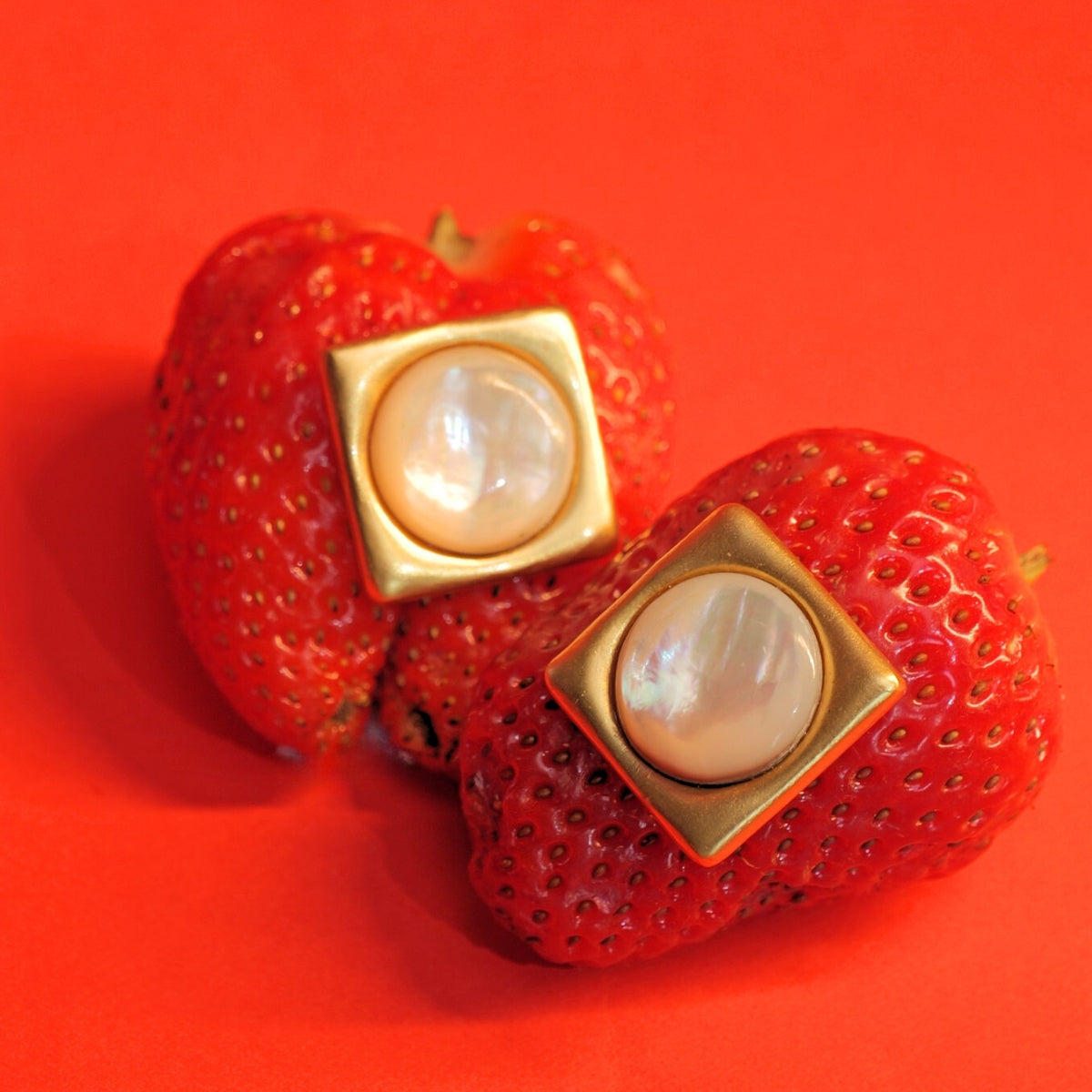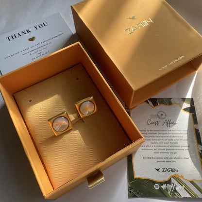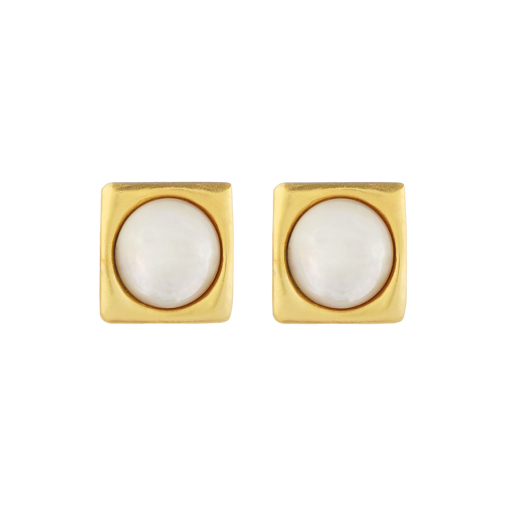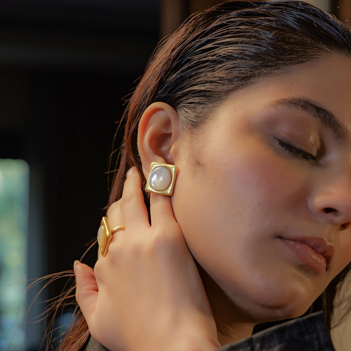 Simple, sleek and polished - this lovely pair of studs earrings boasts of an interesting play of shapes. A 22kt gold plated base in square shape is juxtaposed with a circular shaped flat pearl. Perfect balance of bold and refined, this sleek pair is celebration of geometry and presents it in a minimalist way. A great way to add a touch of luxury and modernity to any outfit. The earrings are extremely wearable and versatile, making them a great travel accessory. Complete the look with the matching ring or brooch from the collection.