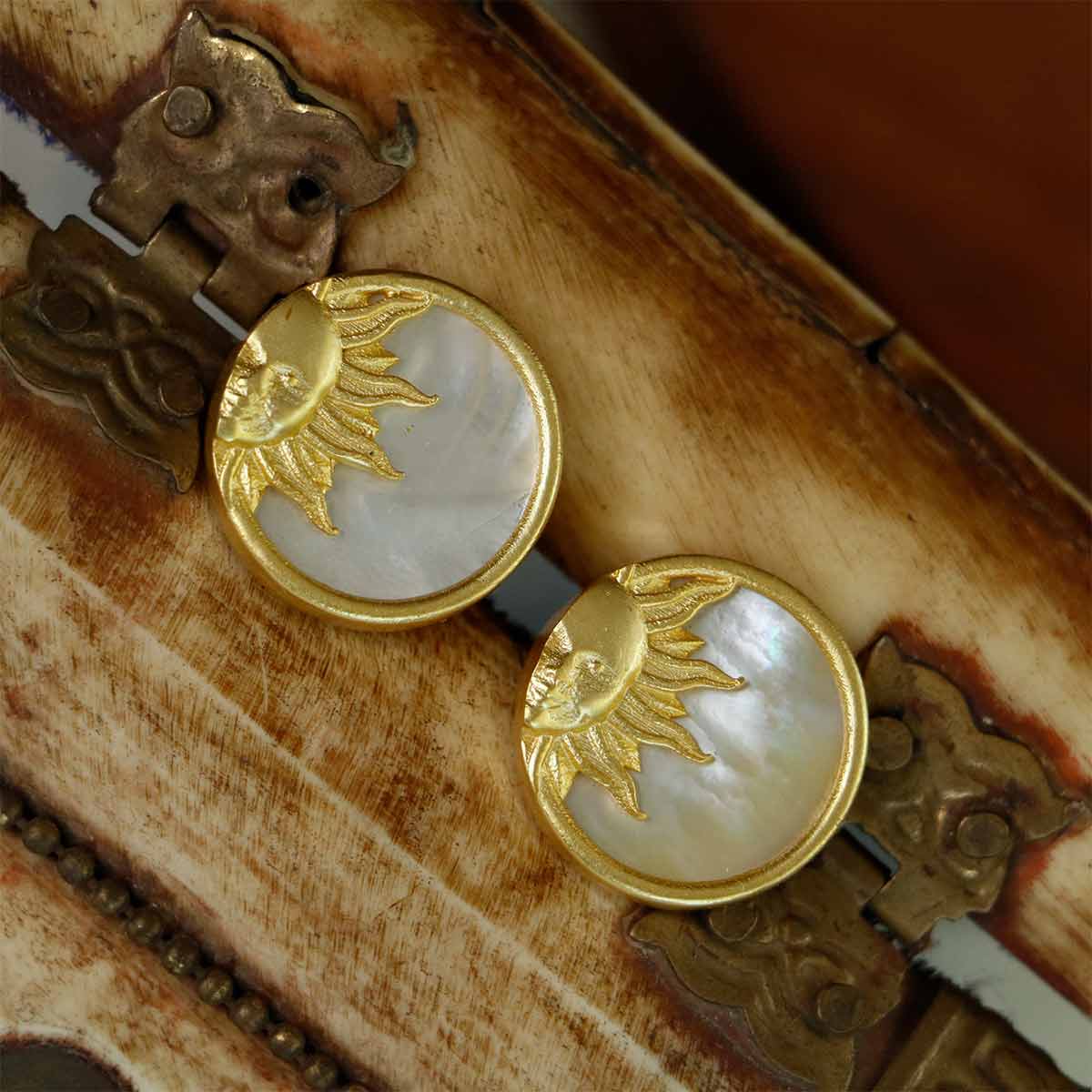 These chic and minimal 22kt gold plated studs earrings are handcrafted discs made of a Mother of Pearl base topped with the Sun motif. Wear these studs to harness the masculine energy of the Sun. The Sun is the symbol of power and strength. It inspires us to embrace our fiery side and seek opportunities. Logic, planning, discipline and structure fall under the sun.