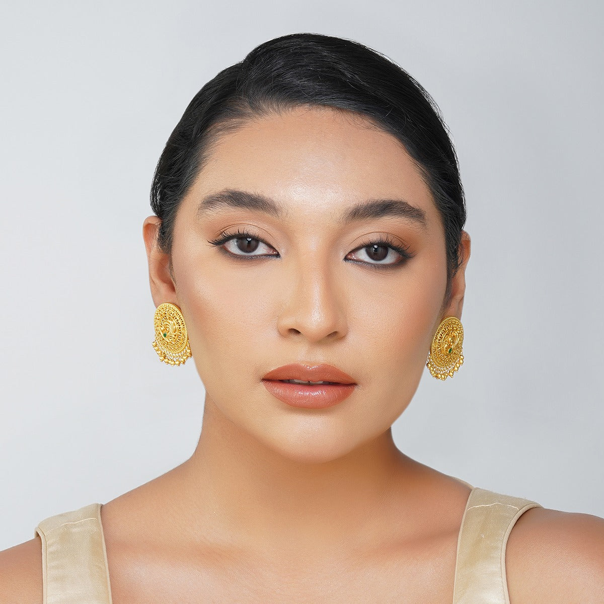 These circular shaped 22kt gold plated stud earrings are inspired by the traditional temple jewellery in the form of an embossed peacock motif which not only holds an artistic significance but also is spiritually and culturally significant. The ethnic inspired motif is laced with delicate filigree work making the pair a perfect amalgamation of two distinct Indian crafts. The earrings are finished with beaded drops and centered with Chatham emeralds.