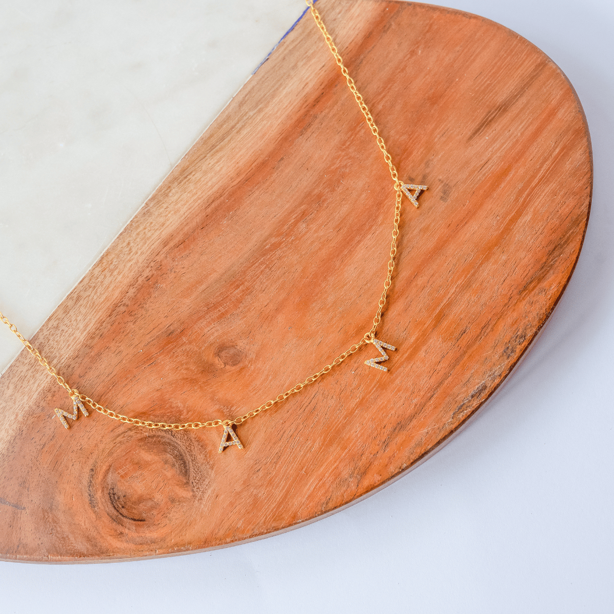 This is a 22kt gold plated letter necklace with MAMA letters studded with Cubic Zircons. It's a beautiful necklace that celebrates the role of a Mama and the journey of motherhood. Wear it as a badge fo pride and love. The necklace makes the perfect Mother's Day gift for Mums!