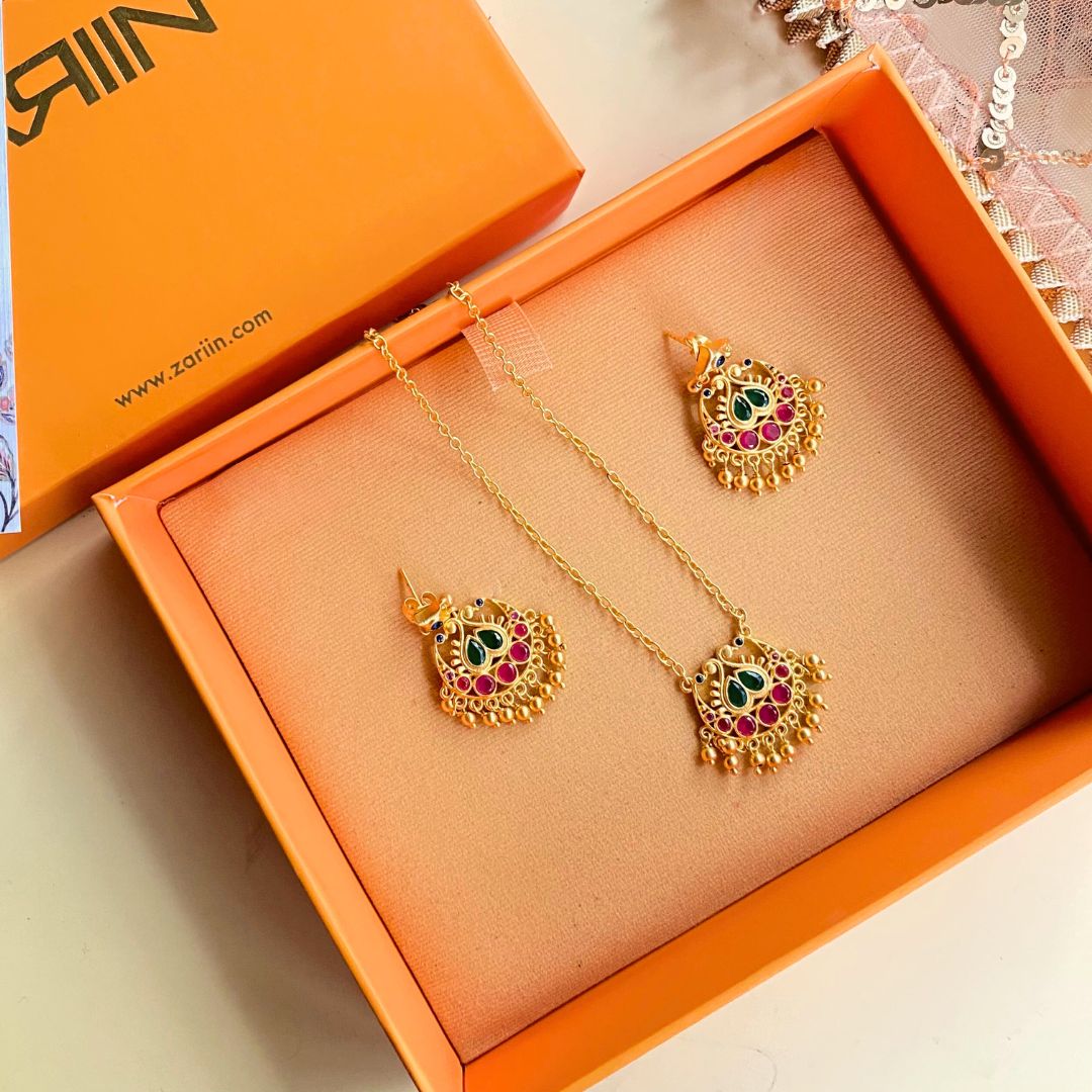 For those who love the harmony of coordinated jewellery, this curated gift box with 22kt gold plated pendant necklace with a chaand motif and chaand baalis to match is the perfect pick. The combination brings together two timeless favourites in Indian jewellery and works beautifully for the perfect festive touch. Wear them together when you want a refined, coordinated aesthetic for festive occasions or weddings, or style them separately to create versatile looks for different outfits. This thoughtfully curated set makes accessorising effortless, while ensuring you always look polished and put together. The jewellery is detailed with Emerald Green, Ruby Red and Blue cubic zircons.
