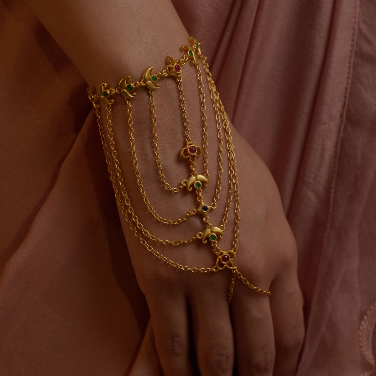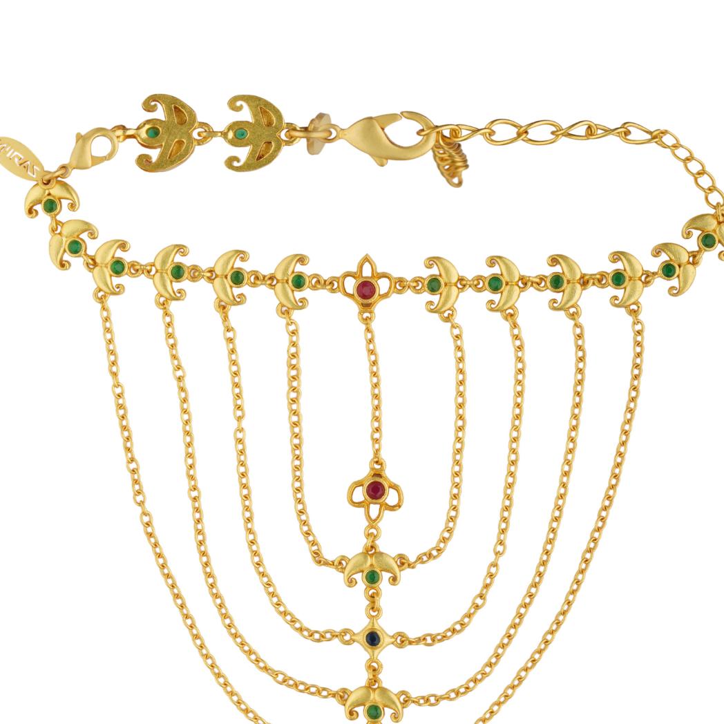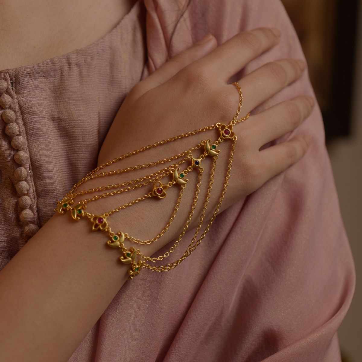 Crafted to delicately drape around your hand, this 22kt gold plated hate fool weaves together fine chains and miniature motifs in an elegant interplay of movement and detail. Studded with Emerald Green, Ruby Red and Blue cubic zircons, the feminine accessory pairs beautifully with festive and bridal ensembles alike. Light on the hand yet rich in charm, it’s a piece that turns every gesture into a little celebration.