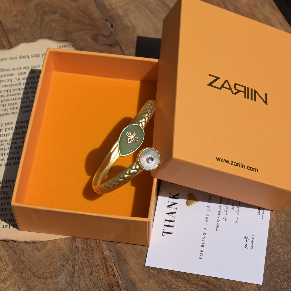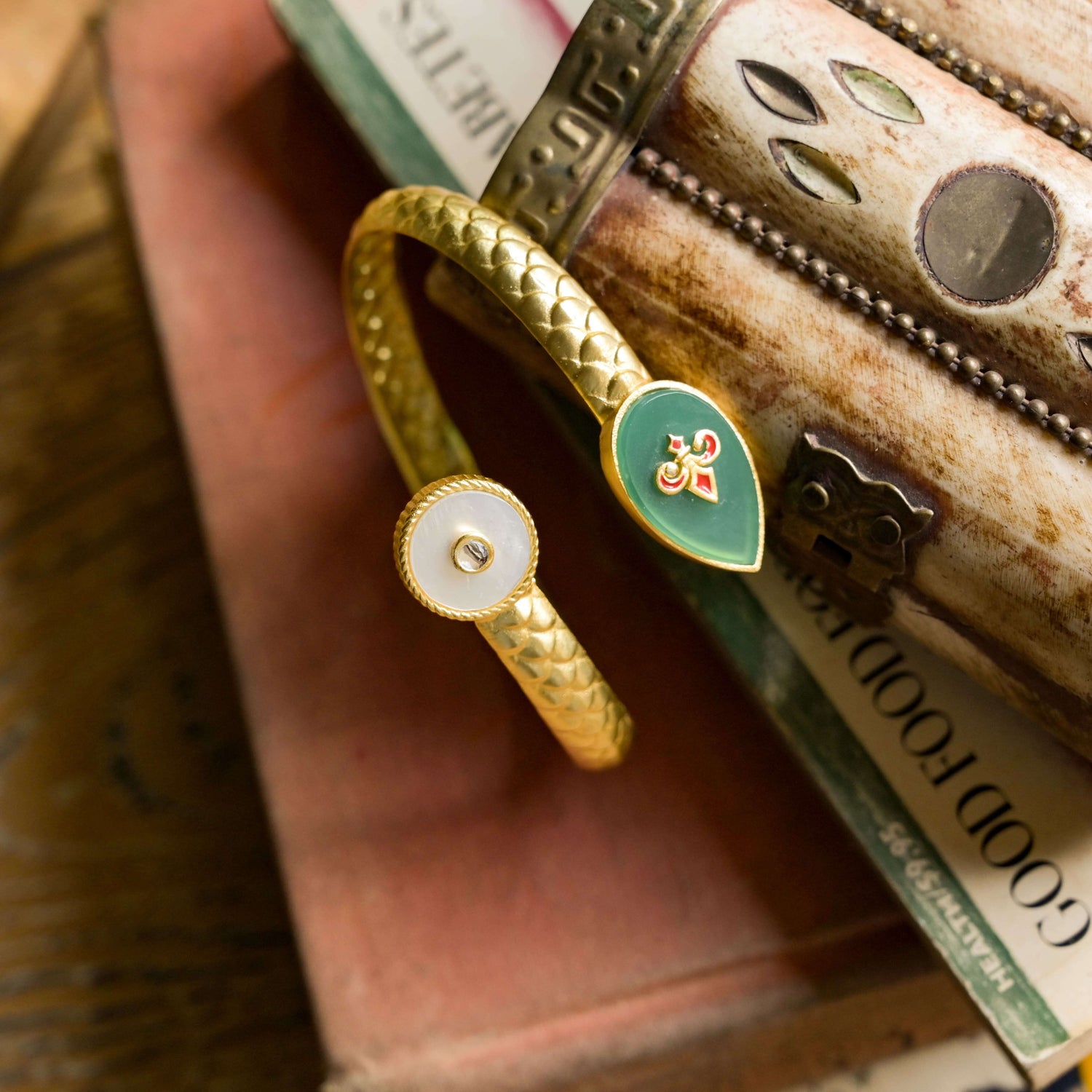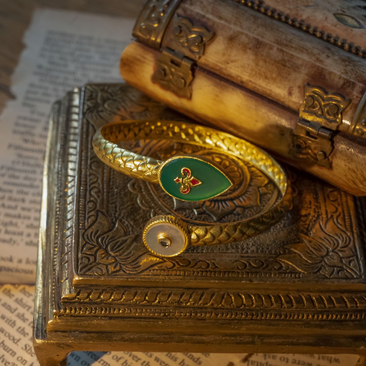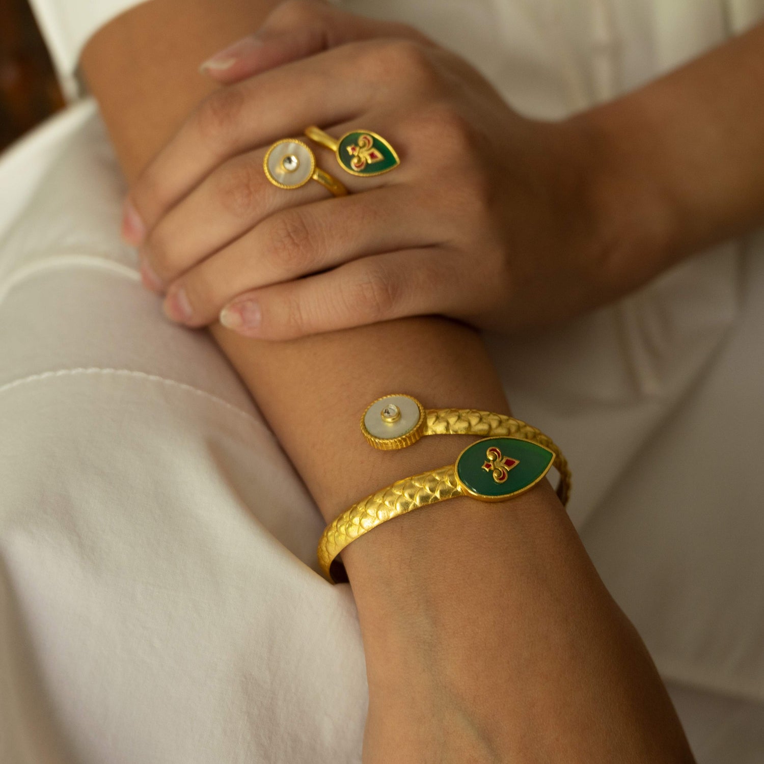 This is 22kt gold plated cuff bracelet with a other of Pearl disc on one end and a Green Onyx drop on the other. The gemstones are further detailed with white stone and elegant motifs crafted using the Holdali technique. A perfect piece of jewellery if you are looking for something minimal yet festive.