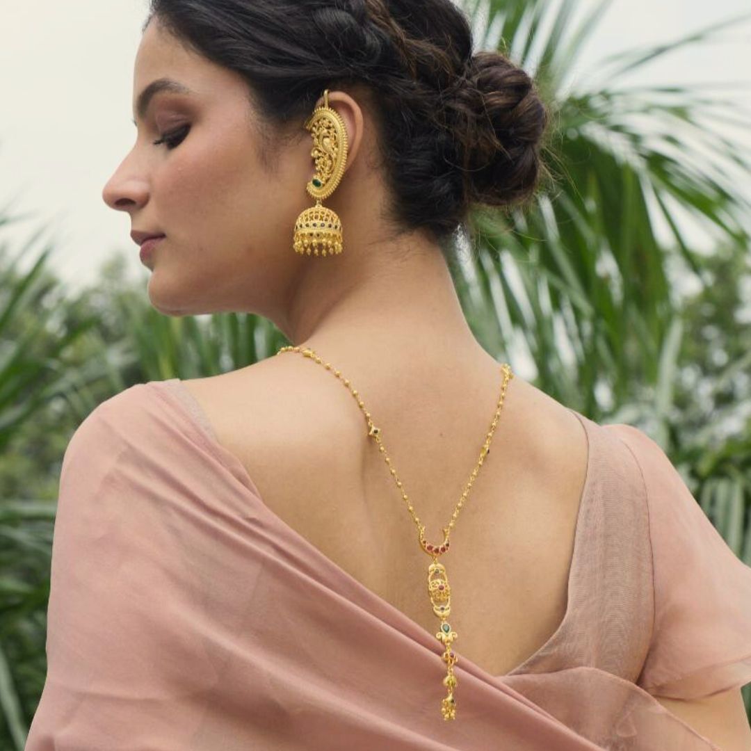 When it comes to completing your look with a classic touch, jhumkas are always a winning choice. And this big,bold and refreshing pair that features an intricately detailed ear cuff as as additional statement is your cue to make a stunning statement.