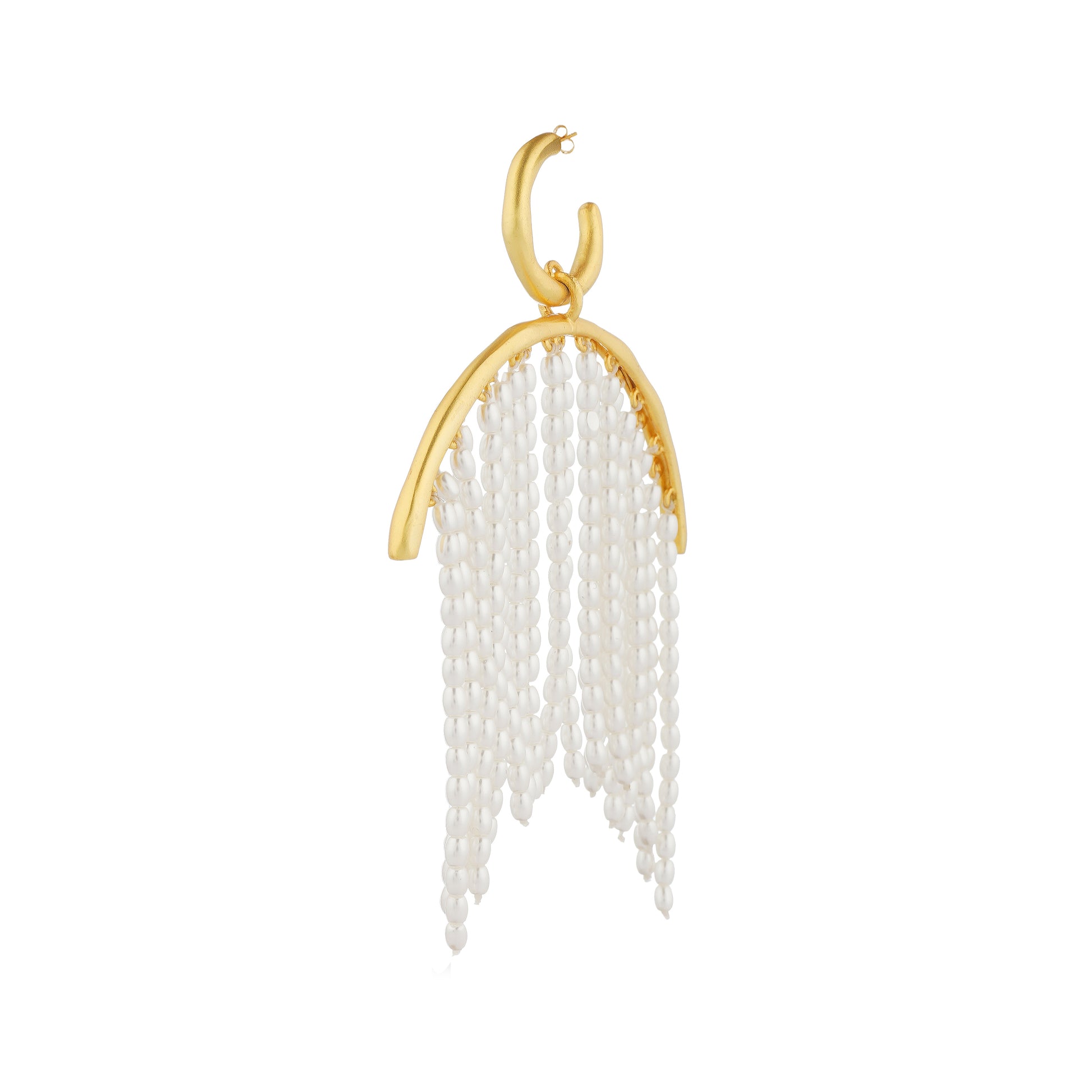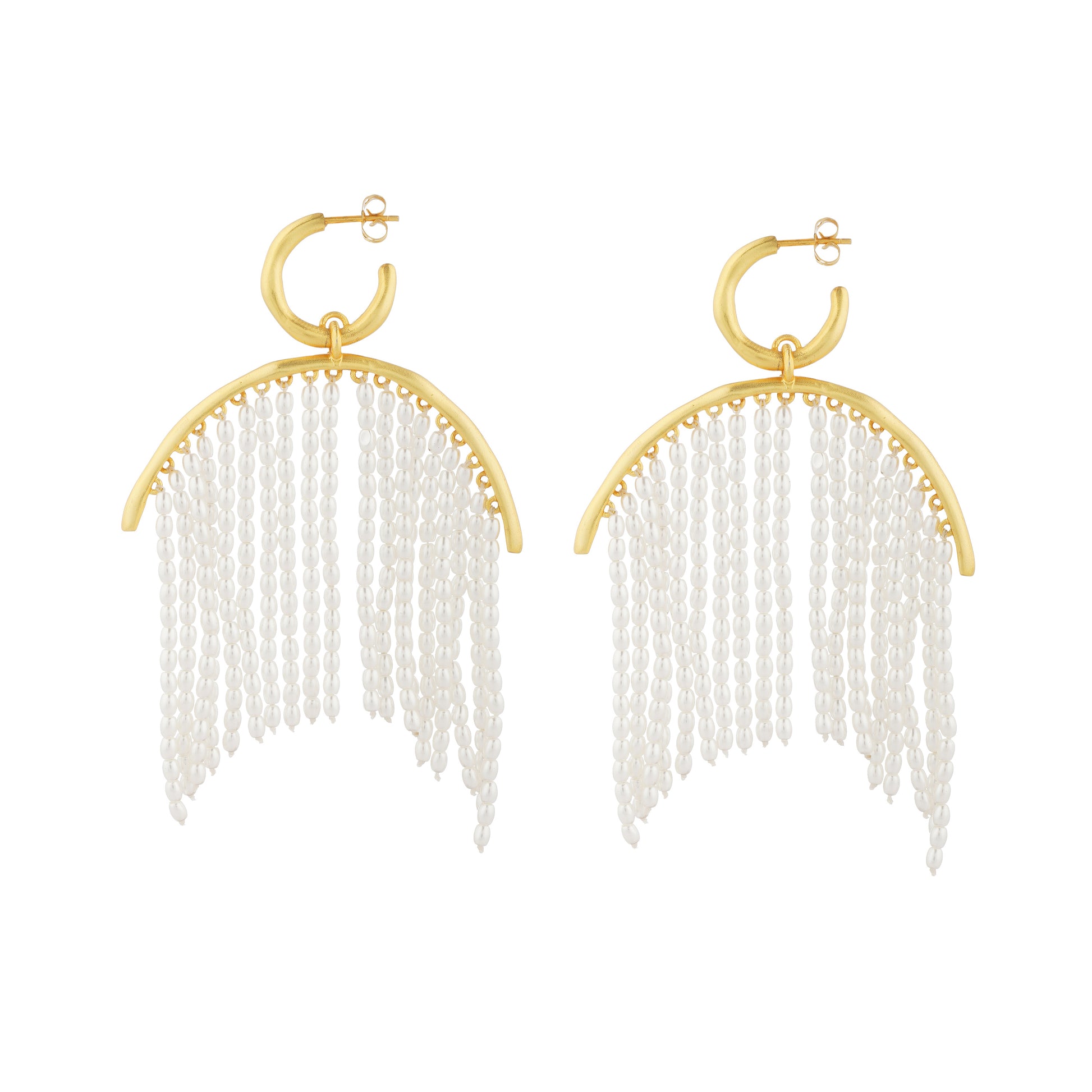 These ultra glam statement earrings, are a modern and contemporary rendition of pearl curtain earrings. Strings of pearls cascade from 22kt gold plated hoops which lend a dynamic and fluid movement to the piece adding to the visual impact of the earrings. Perfect for when you are looking for a truly statement pair to make a bold fashion statement. The earrings are polished, fun and truly impressive.
