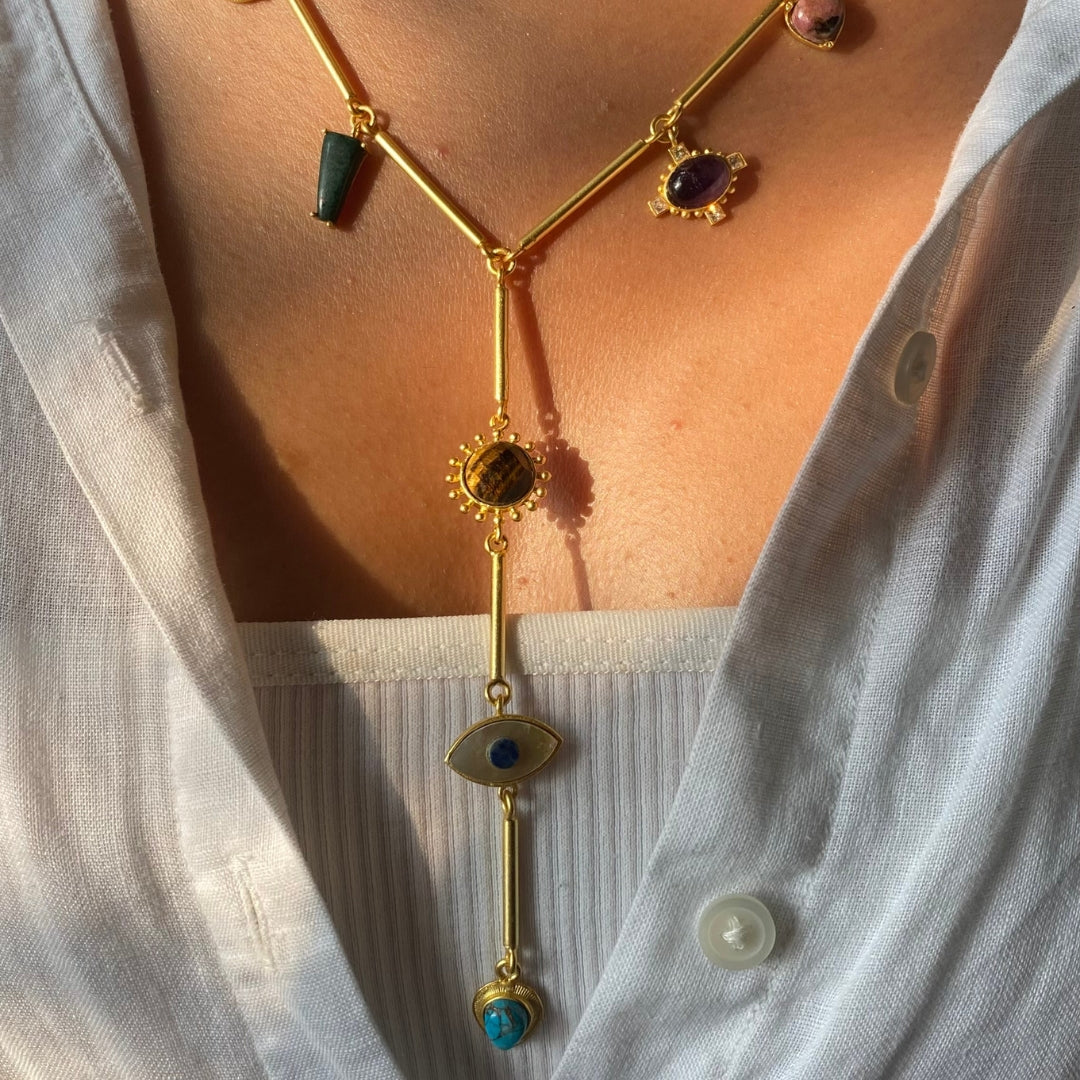 This delicate 22 kt gold plated lariat necklace is made with 7 healing gemstones that are proven to infuse positivity, joy and abundance, and bring alignment of the chakras in our body. Lariat necklaces are feminine and work best with plunging necklines, high necks and can be layered under collars