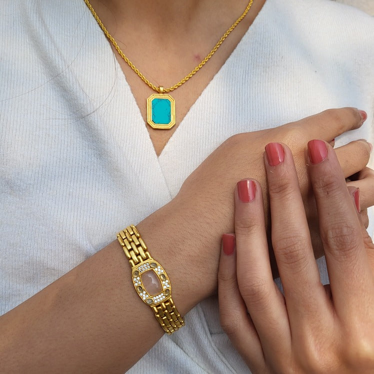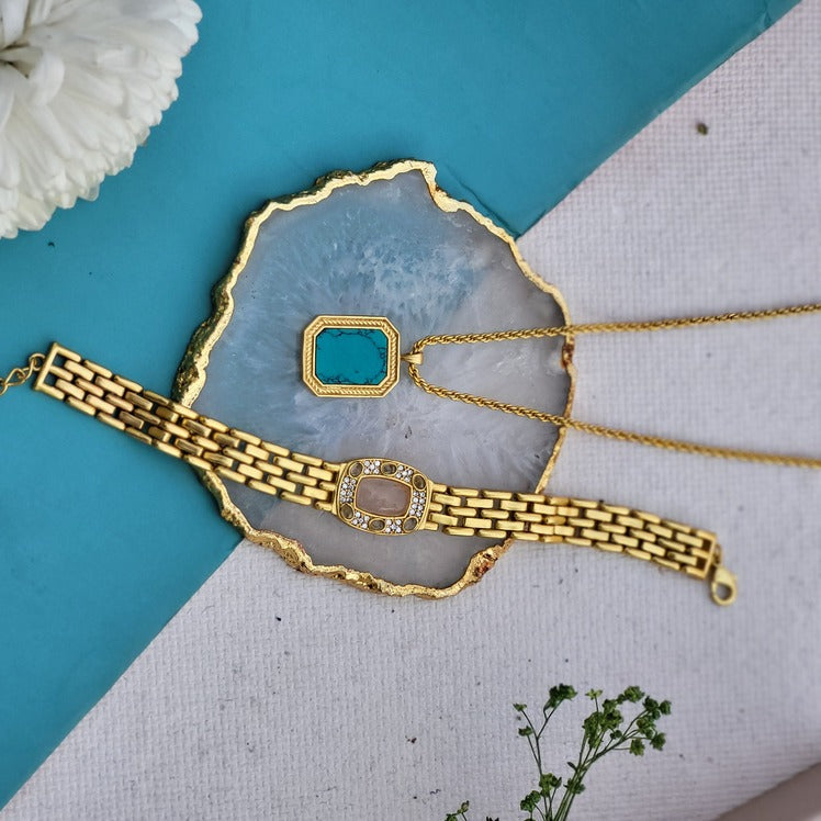Craving for that warm, fuzzy feeling called love? This combination of 22kt gold plated Rose Quartz healing bracelet and rectangle shaped Turquoise pendant necklace is the perfect combination for you. Wear these crystals to raise your own vibrations and align yourself to the frequencies of love - be it with your relationship with self or others.