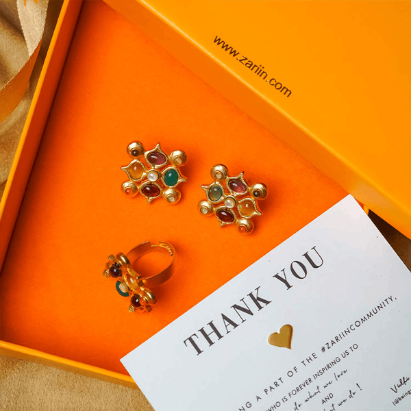 A minimal yet impactful gift box with 22kt gold plated Navratna jewellery that includes a pair of stud earrings and a matching ring. The jewellery is contemporary yet rooted in tradition and a perfect option for someone who likes to wear jewellery everyday.
