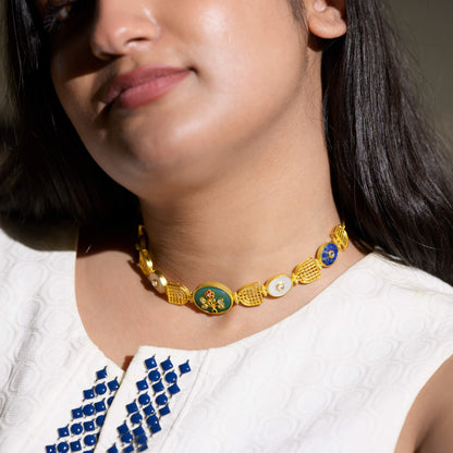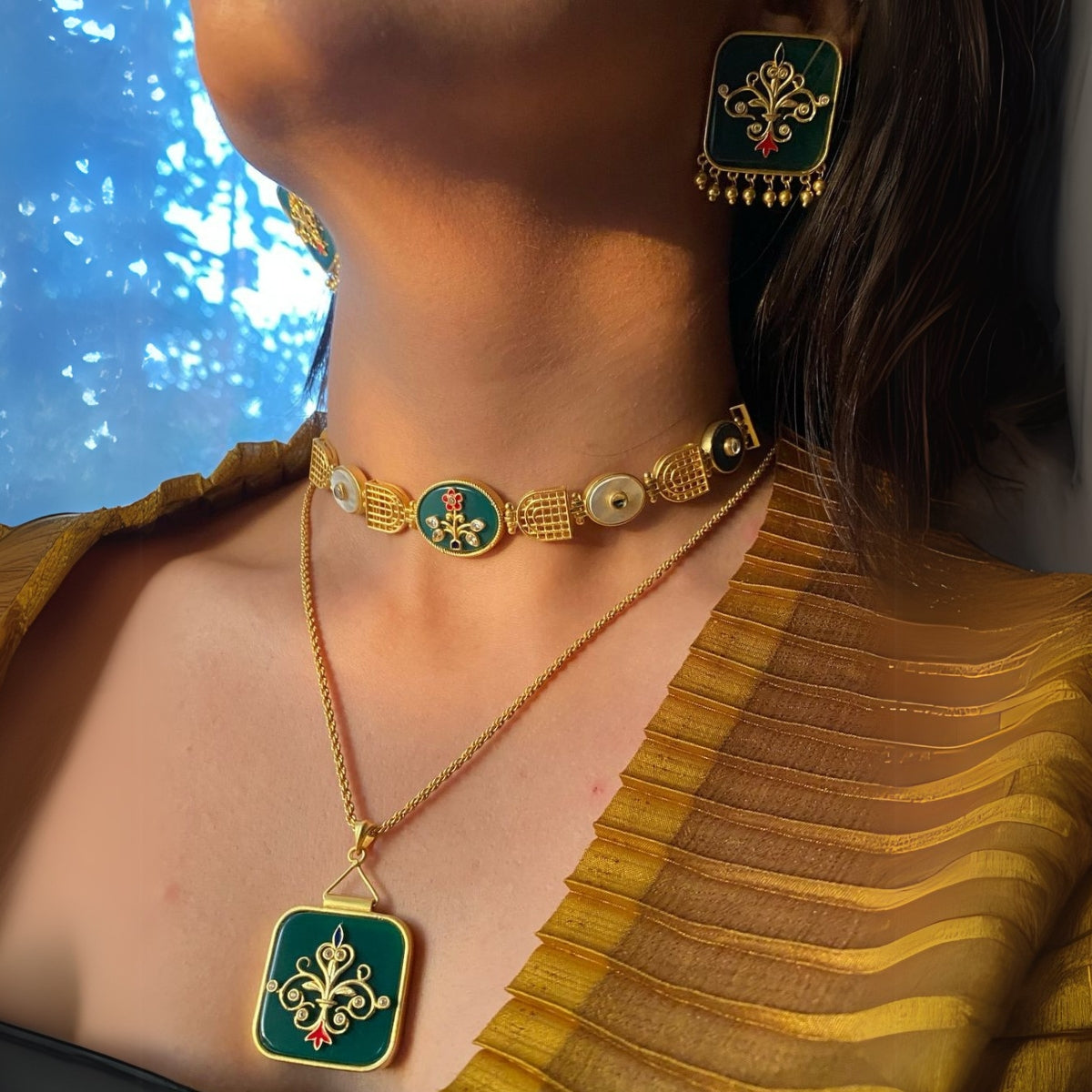 This is a 22kt gold plated layered necklace & earring set that spells impressive and festive. It's a piece of jewellery that pure joy, will stand the test of time and become an heirloom. Intricate filigree motifs in combination with circular discs of Green, Onyx, Lapis Lazuli and Mother of Pearl detailed with elegant motifs crafted with age old Holdali technique. Red and Blue enamel with Cubic Zircon add to the detail.