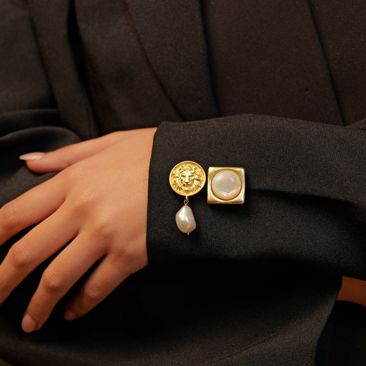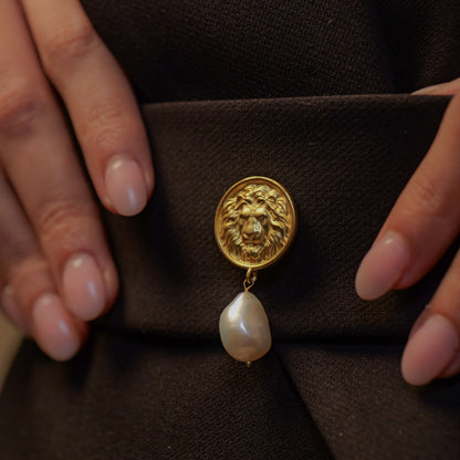 This 22kt gold plated coin brooch is detailed with a face of a lion which resonates well with the relentless spirit of women on the go. The lovely baroque pearl drop adds to the fluidity of the piece and elegance.