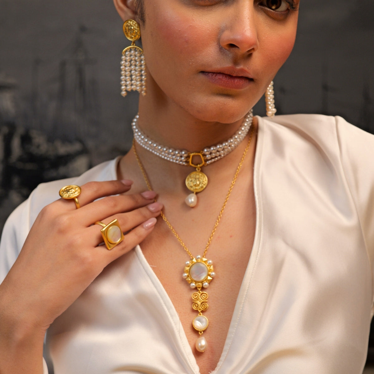 Coast Affair uses vibrant gemstones like Malachite, Turquoise and Garnet which are inspired by the colours of the sea. The collection also uses Pearls and Baroque Pearls which are elements and treasures straight from the ocean.