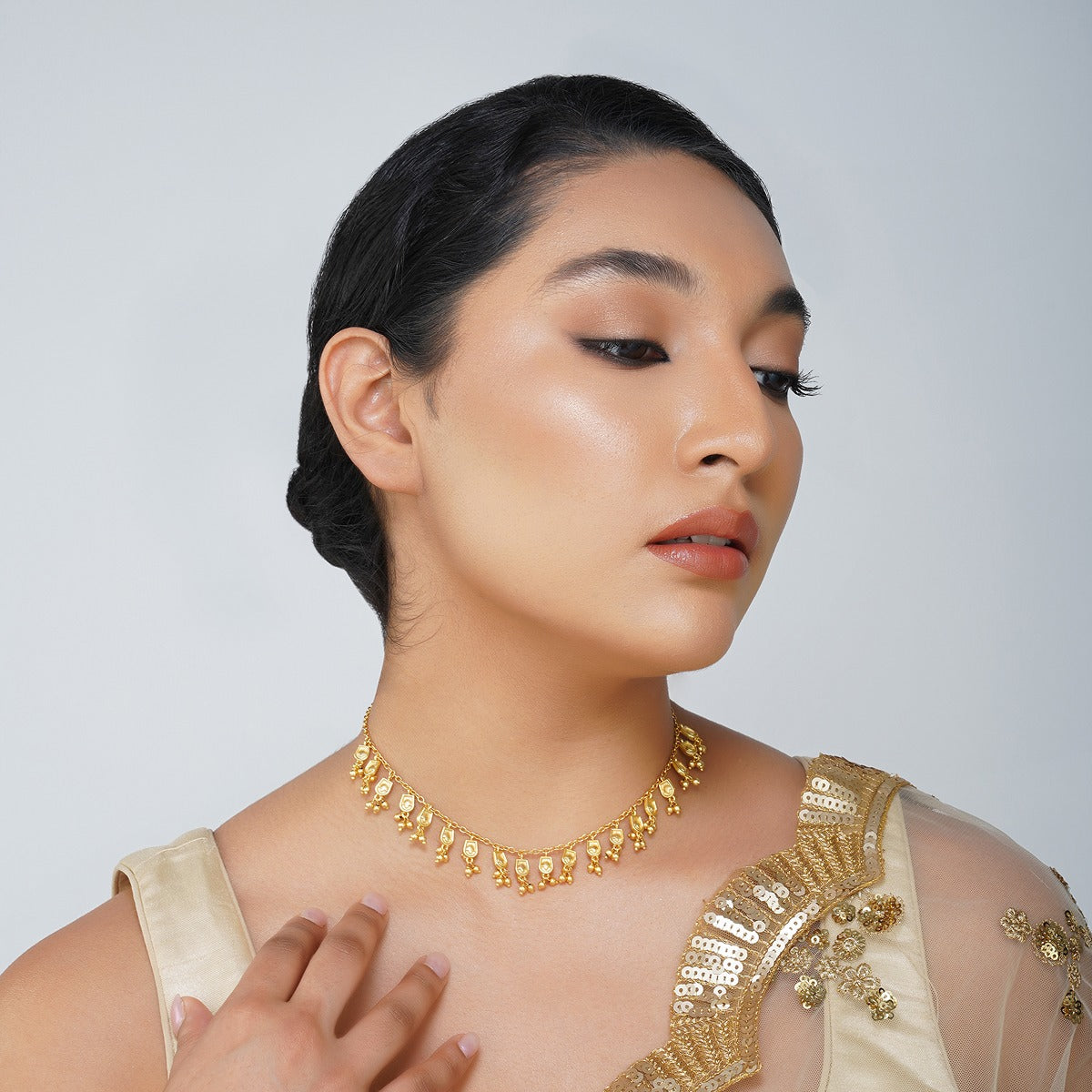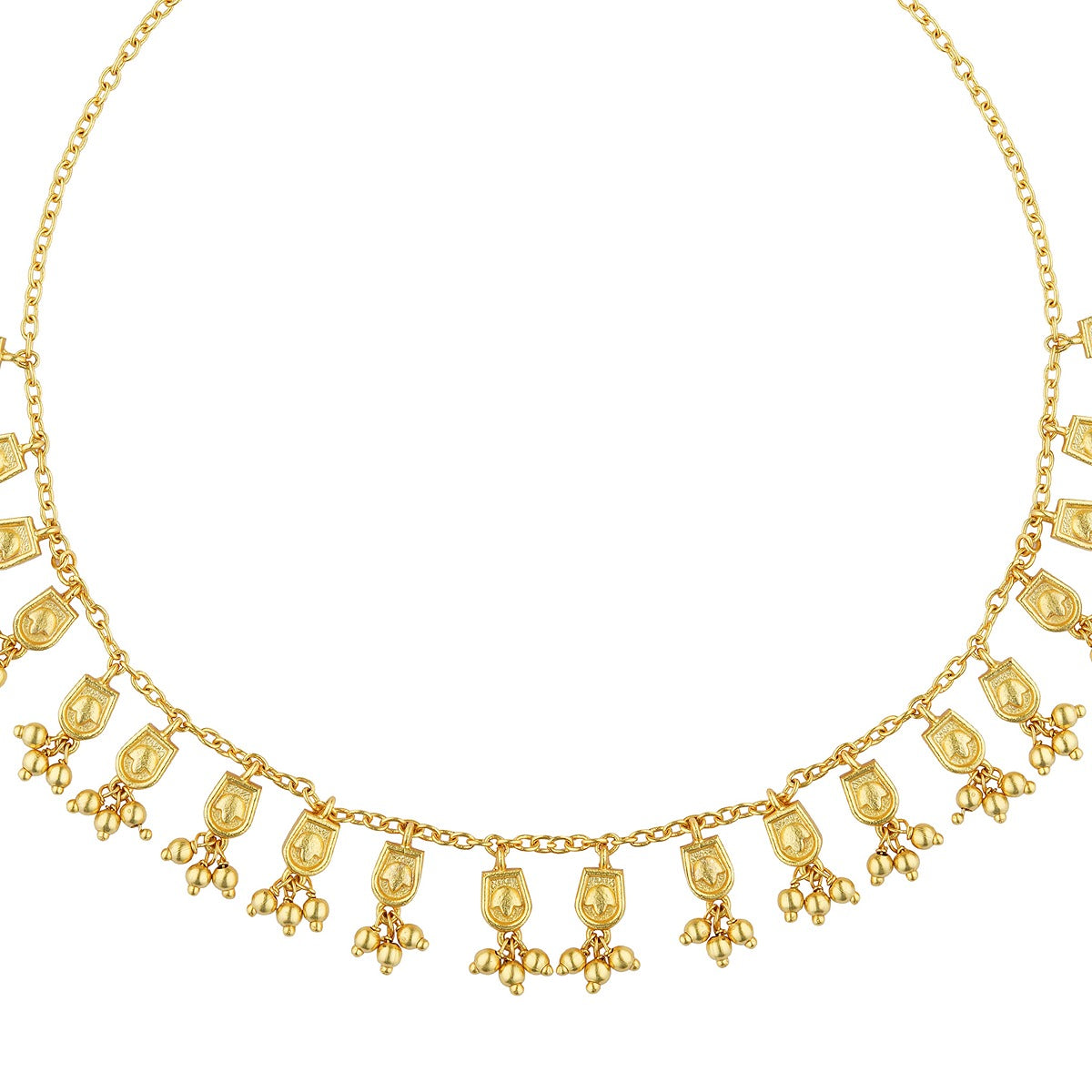 A delicate, lightweight but impactful necklace dressed up with embossed metal drops and beads. The 22kt gold dipped necklace is a contemporary and lightweight adaptation of the traditional temple jewellery. It's feminine, eye catching and oozes a lot of style. The necklace boasts of an effortless flair that you'll love to flaunt and accessorize your traditional festive wear with.