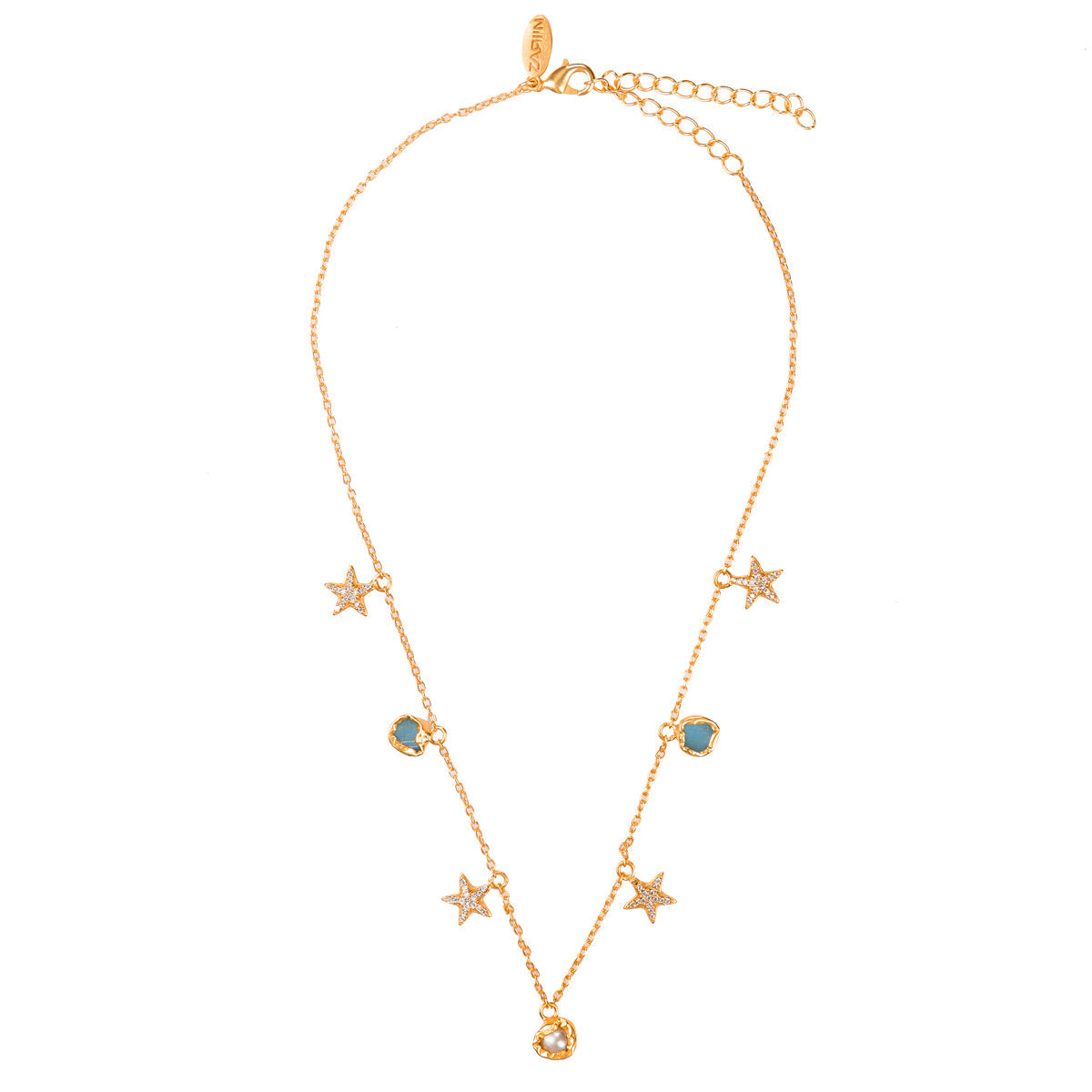 A metaphor for energy and strength - this necklace is a beautiful blend of raw gemstones, baroque pearl and 22kt gold dipped motifs embedded with sparkling cz.