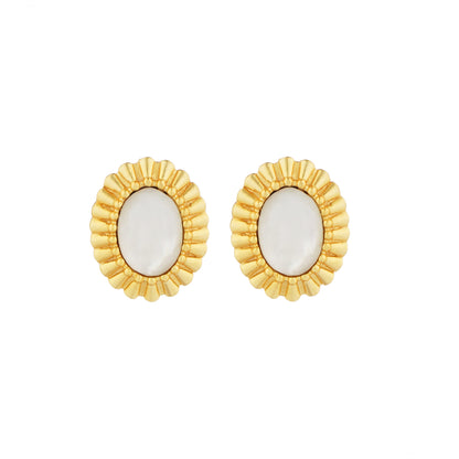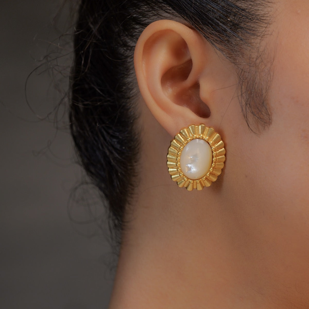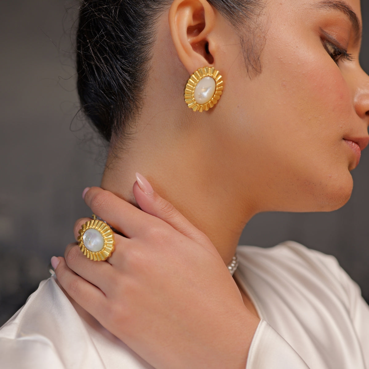 Looking for something that's modern yet captures the essence of classic aesthetics? This lovely combination of stud earrings and a ring to match is just what you need. The 22kt gold plated earrings are a modern rendition of classic oval shaped stud earrings. A luminous oval shaped pearl is framed with a 22kt gold plated textured edge which works as a beautiful contrast. Refined, polished and extremely wearable, the earrings and the matching ring are timeless and the perfect day to night wear. A perfect look to ace your accessorising game and travel style.