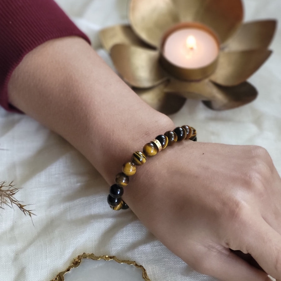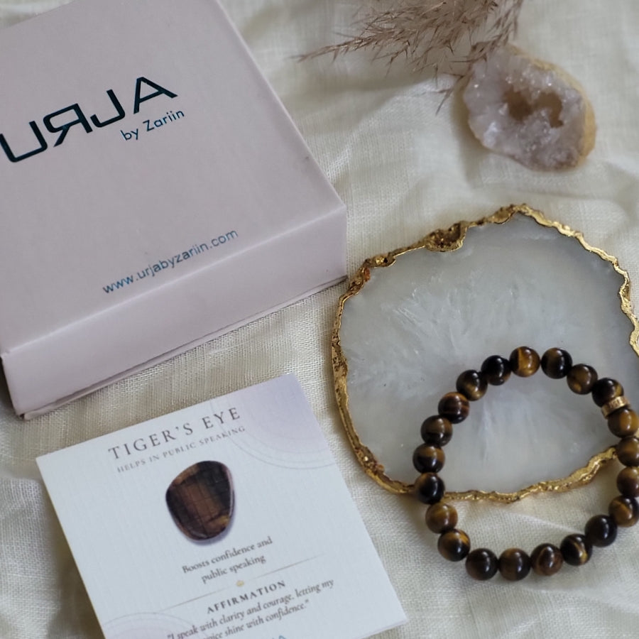 Tigers Eye is a powerful stone that offers balance, grounding, and protection. It combines the energies of the Earth and the Sun, promoting both physical vitality and spiritual clarity. Tigers Eye is believed to bring about mental clarity, allowing the wearer to make better decisions and think with focus. It is often used as a stone of protection, guarding against negative energies and boosting confidence and courage. This stone stimulates the root and solar plexus chakras, promoting stability, confidence, and personal empowerment. It helps in times of stress or fear, giving the wearer the strength to face challenges head-on. Comes luxuriously packed in Urja boxes.